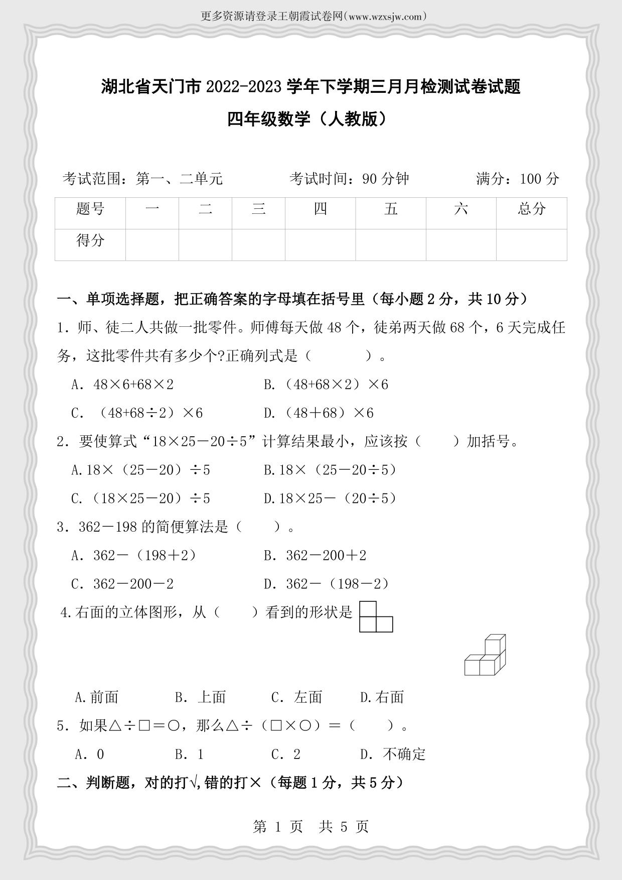 湖北省天门市2022-2023学年下学期三月月检测试卷试题四年级数学(人教版)