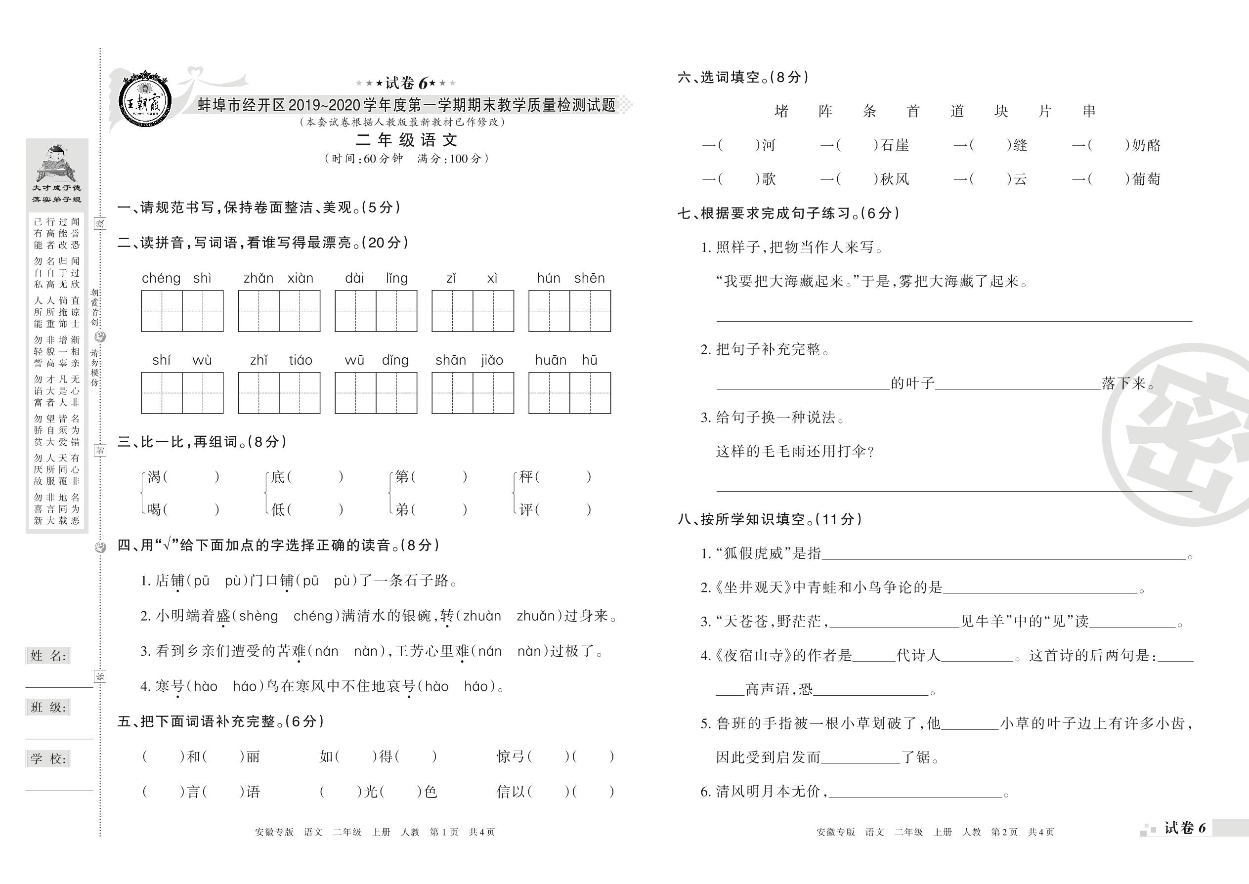 2019-2020学年第一学期蚌埠市经开区二年级语文试卷(人教版)【6】