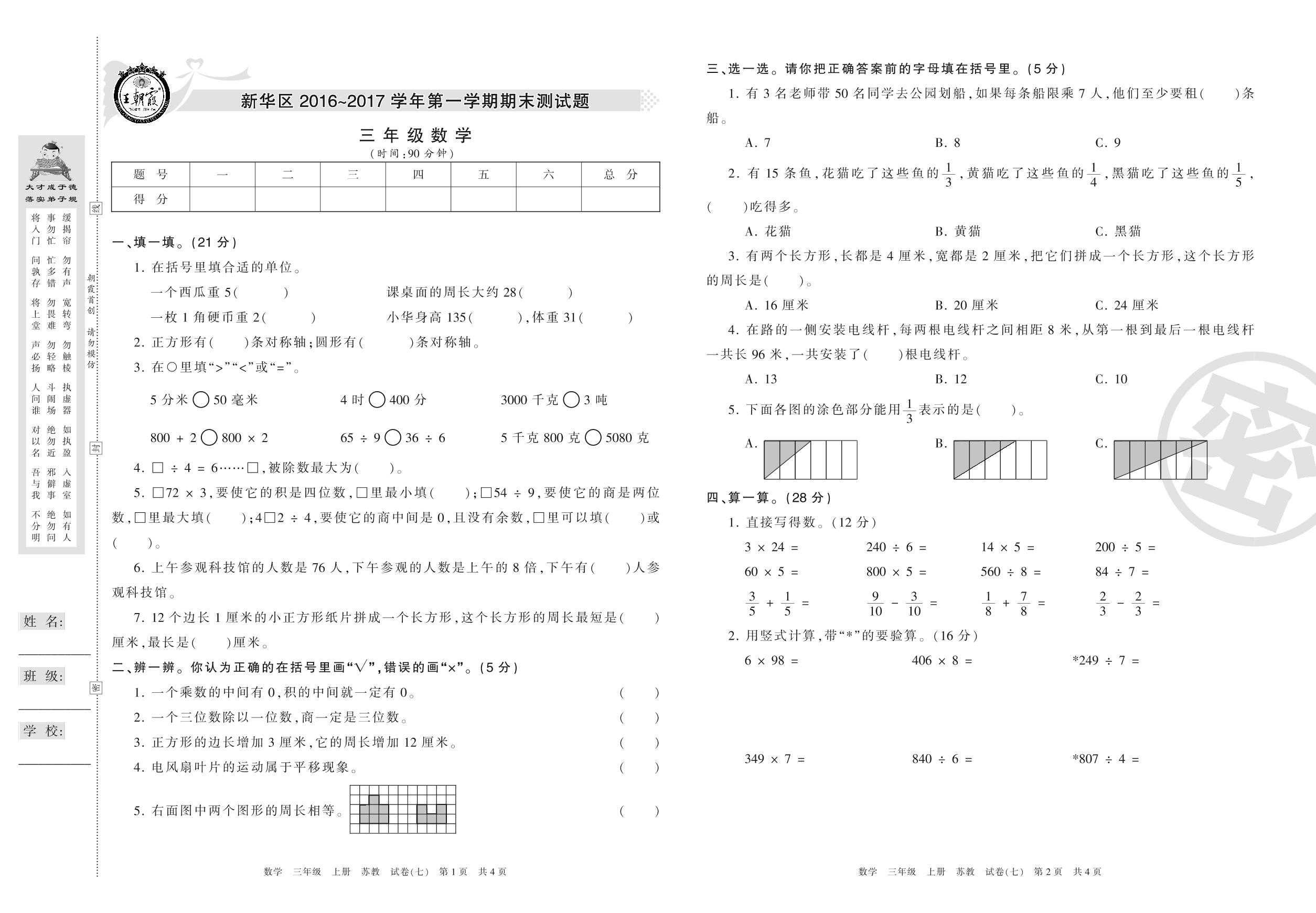 2016-2017学年第一学期平顶山市新华区三年级数学试卷(苏教版)【7】