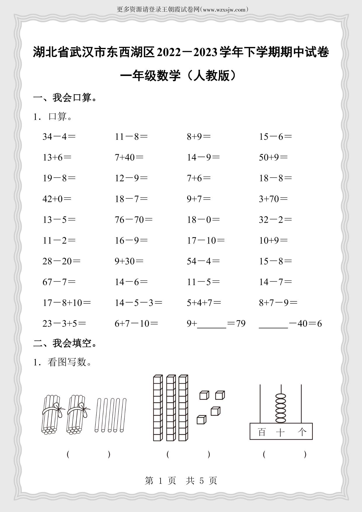 湖北省武汉市东西湖区2022-2023学年下学期期中试卷一年级数学(人教版)