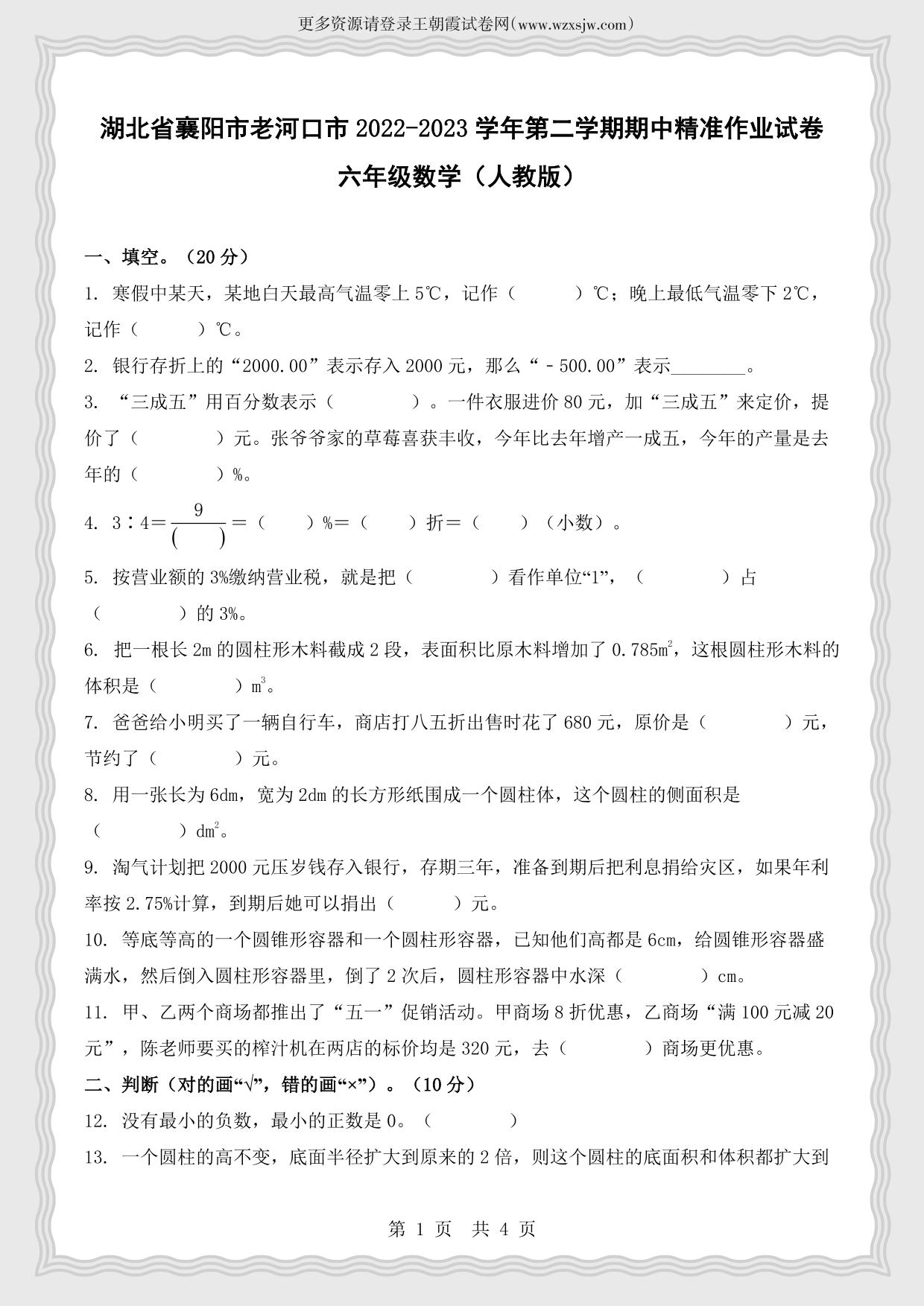 湖北省襄阳市老河口市2022-2023学年第二学期期中精准作业试卷六年级数学(人教版)