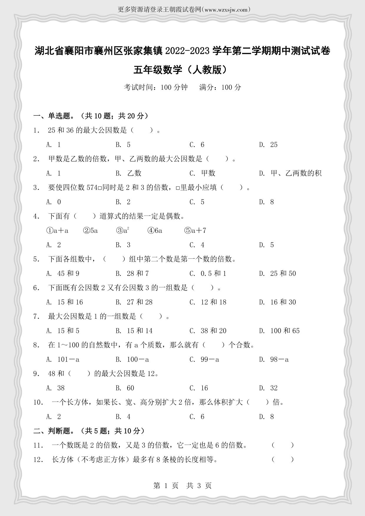 湖北省襄阳市襄州区张家集镇2022-2023学年第二学期期中测试试卷五年级数学(人教版)