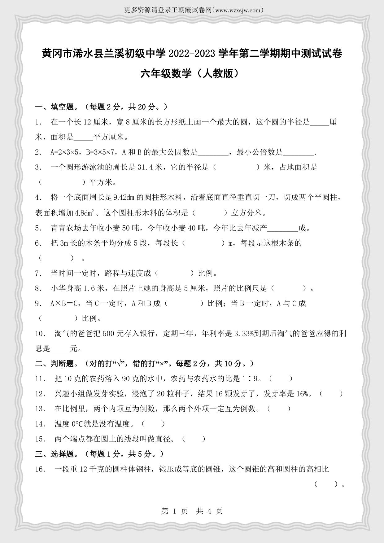 湖北省黄冈市浠水县兰溪初级中学2022-2023学年第二学期期中测试试卷六年级数学(人教版)