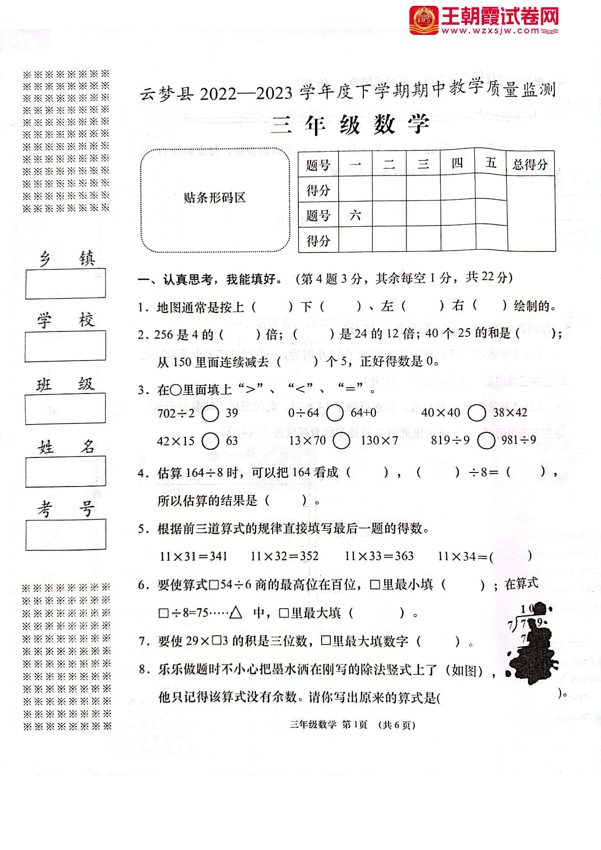 湖北省孝感市云梦县2022-2023学年三年级下学期期中教学质量监测数学试题(人教版)