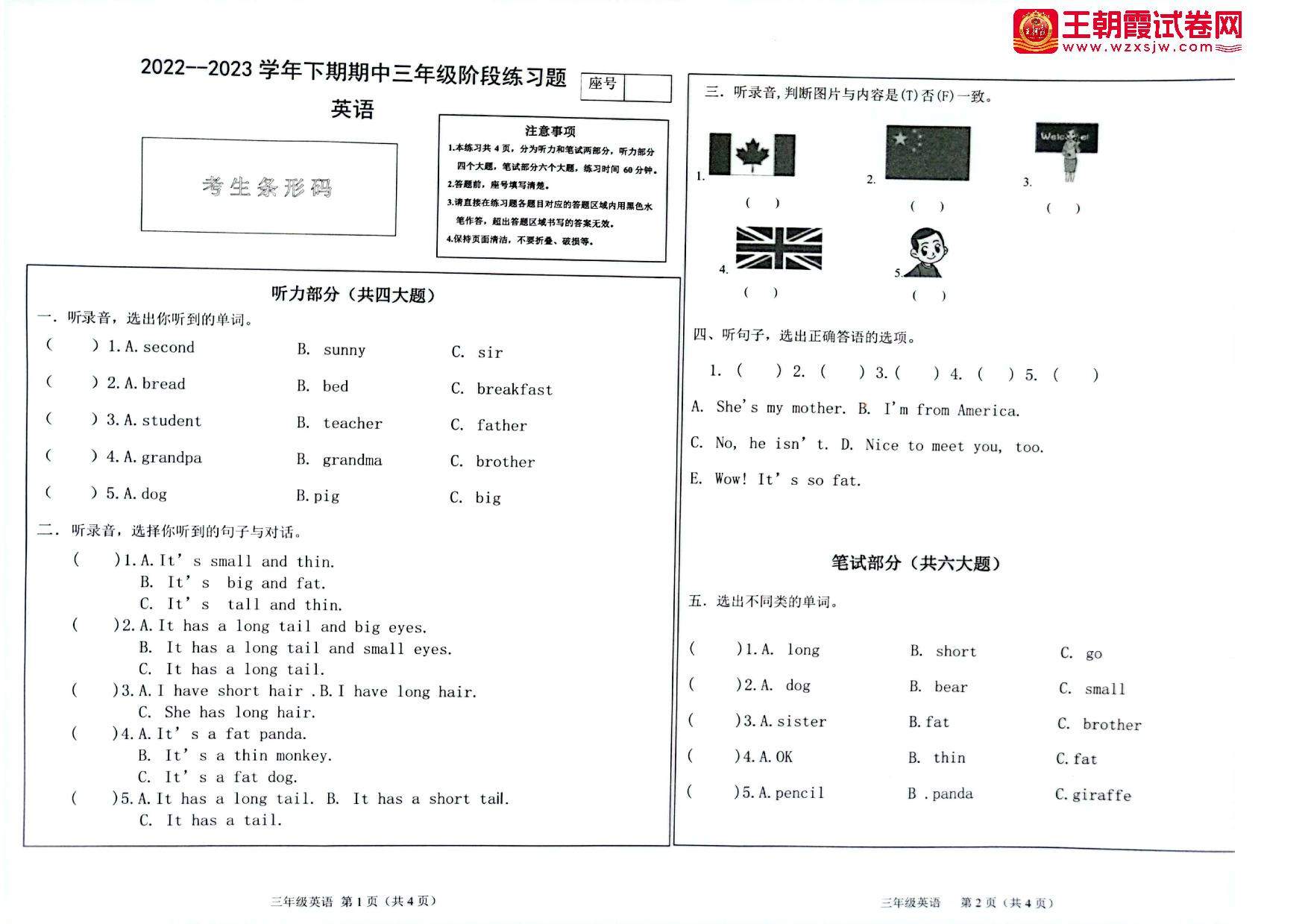 河南省周口市西华县2022—2023学年下学期期中阶段练习三年级英语(人教PEP版)【无听力音频】