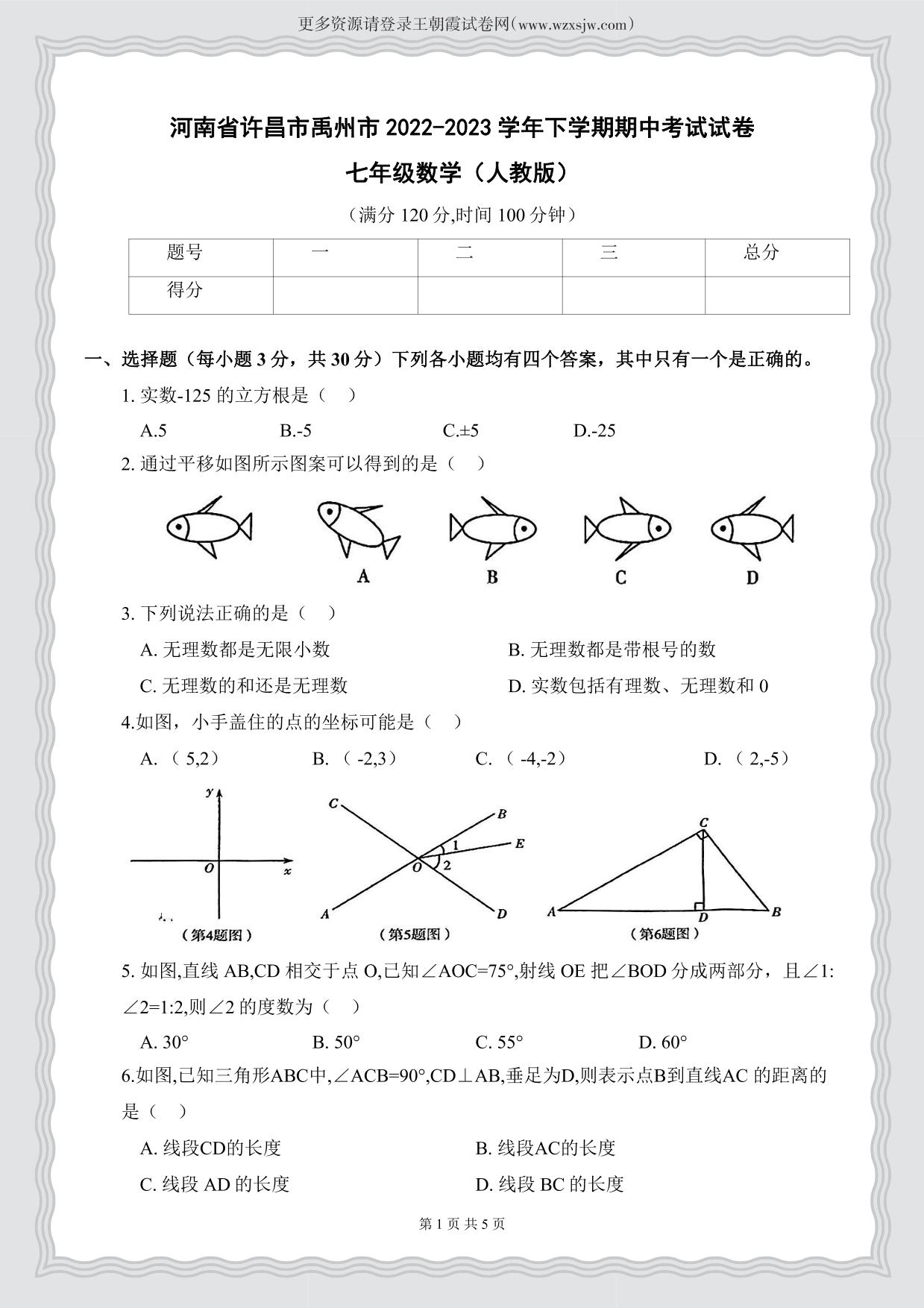 河南省许昌市禹州市2022—2023学年下学期期中考试试卷七年级数学(人教版)