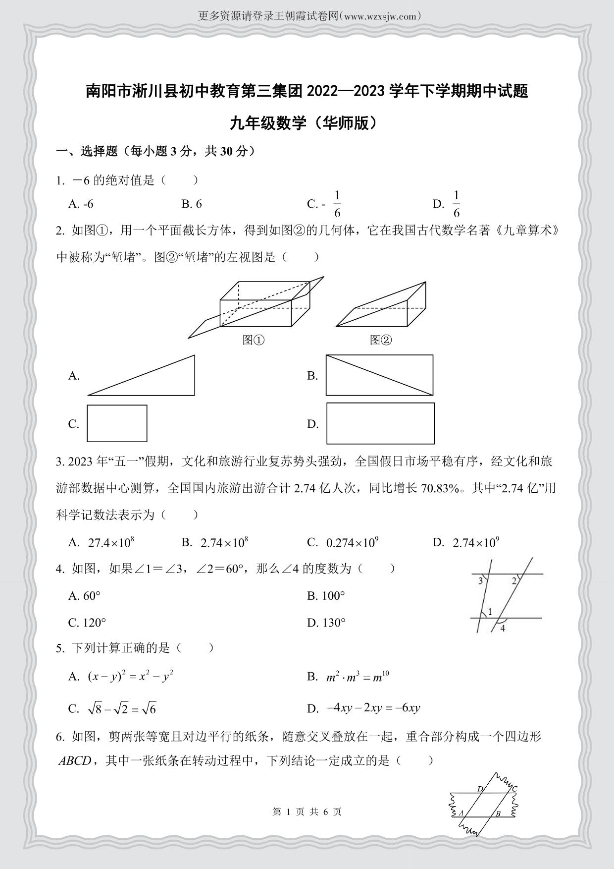 河南省南阳市淅川县初中教育第三集团2022—2023学年下学期期中试题九年级数学(华师版)