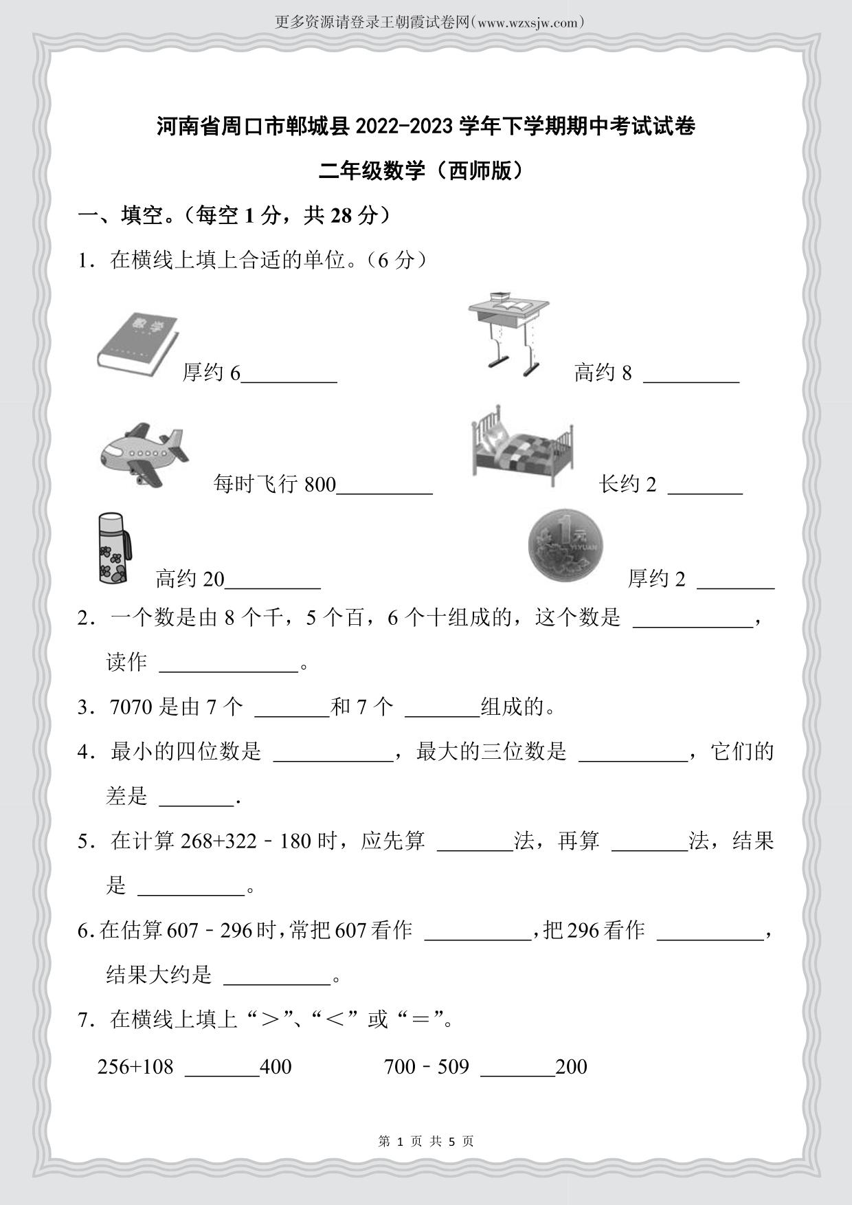 河南省周口市郸城县2022—2023学年下学期期中考试试卷二年级数学(西师版)