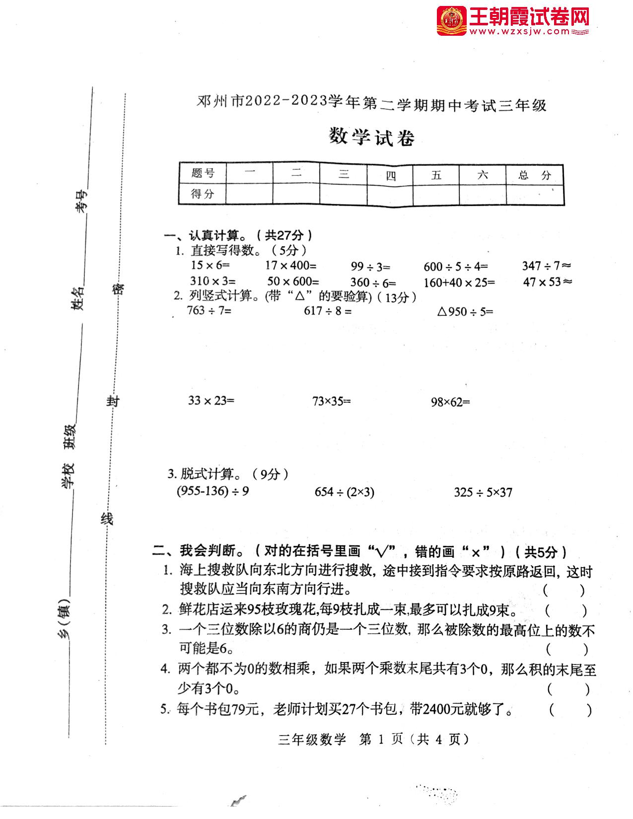 河南省南阳市邓州市2022—2023学年第二学期期中考试试卷三年级数学(人教版)