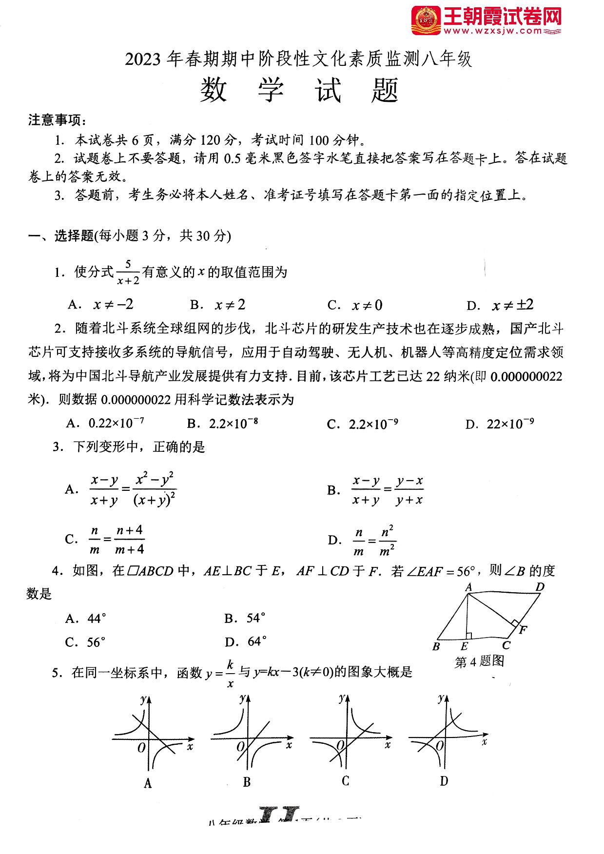 河南省南阳市唐河县2022—2023学年春期期中考试学试题八年级数学(华师版)
