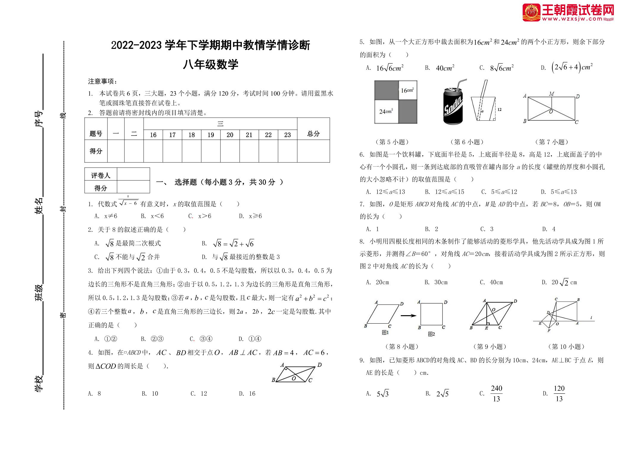 河南省三门峡市陕州区2022—2023学年下学期期中教情学情诊断八年级数学(人教版)