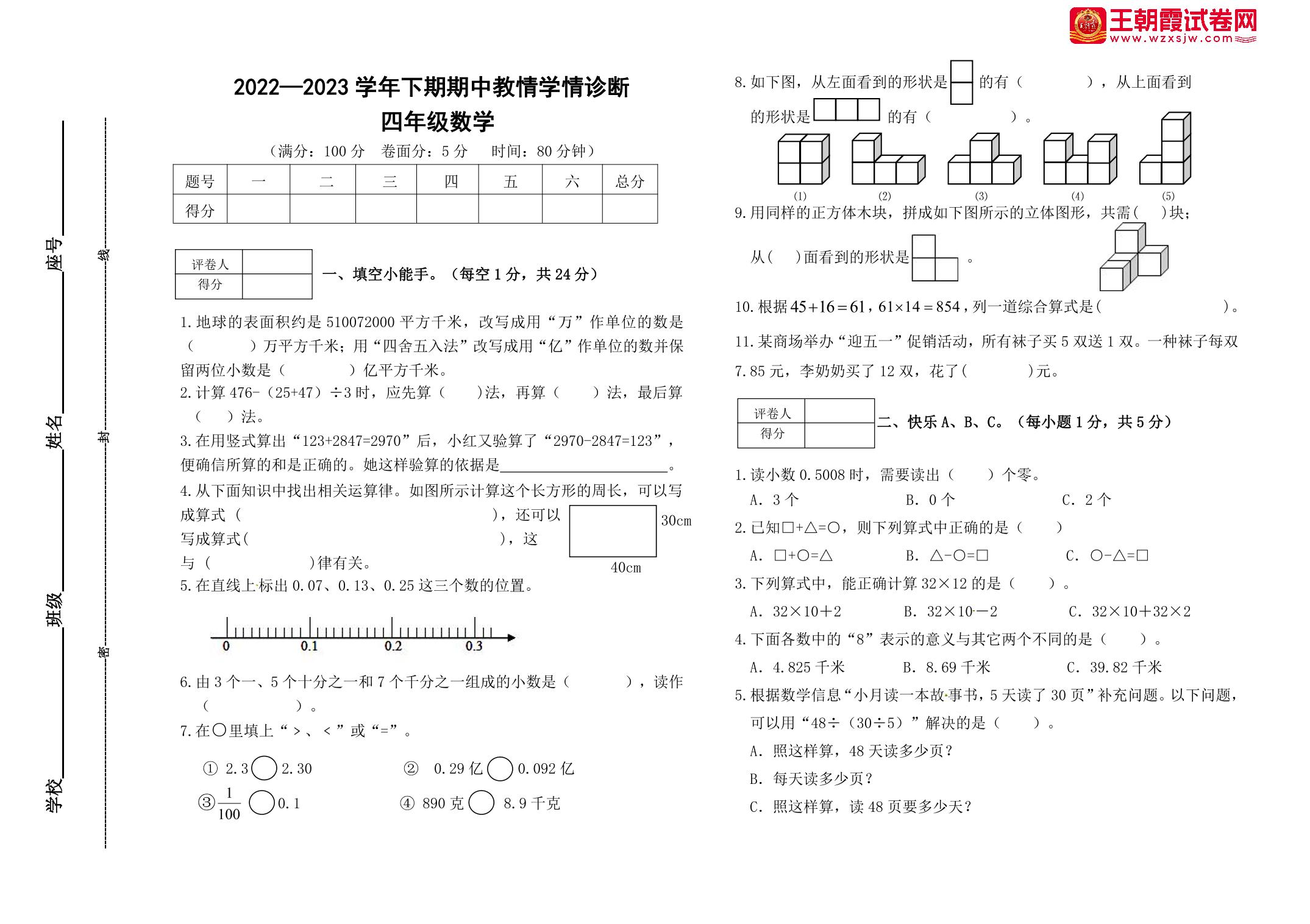 四年级数学人教版下册期中卷