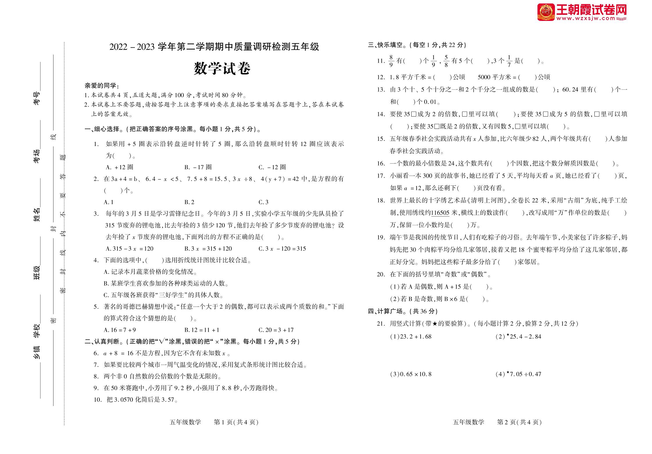 河南省洛阳市伊川县2022—2023学年下学期期中考试试题五年级数学(苏教版)