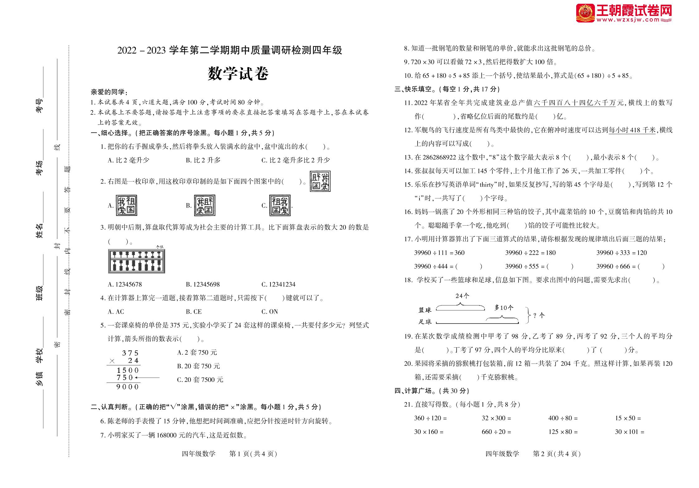河南省洛阳市伊川县2022—2023学年下学期期中考试试题四年级数学(苏教版)