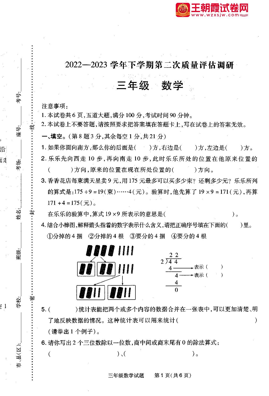 河南省信阳市平桥区2022—2023学年下学期期中考试试题三年级数学(人教版)