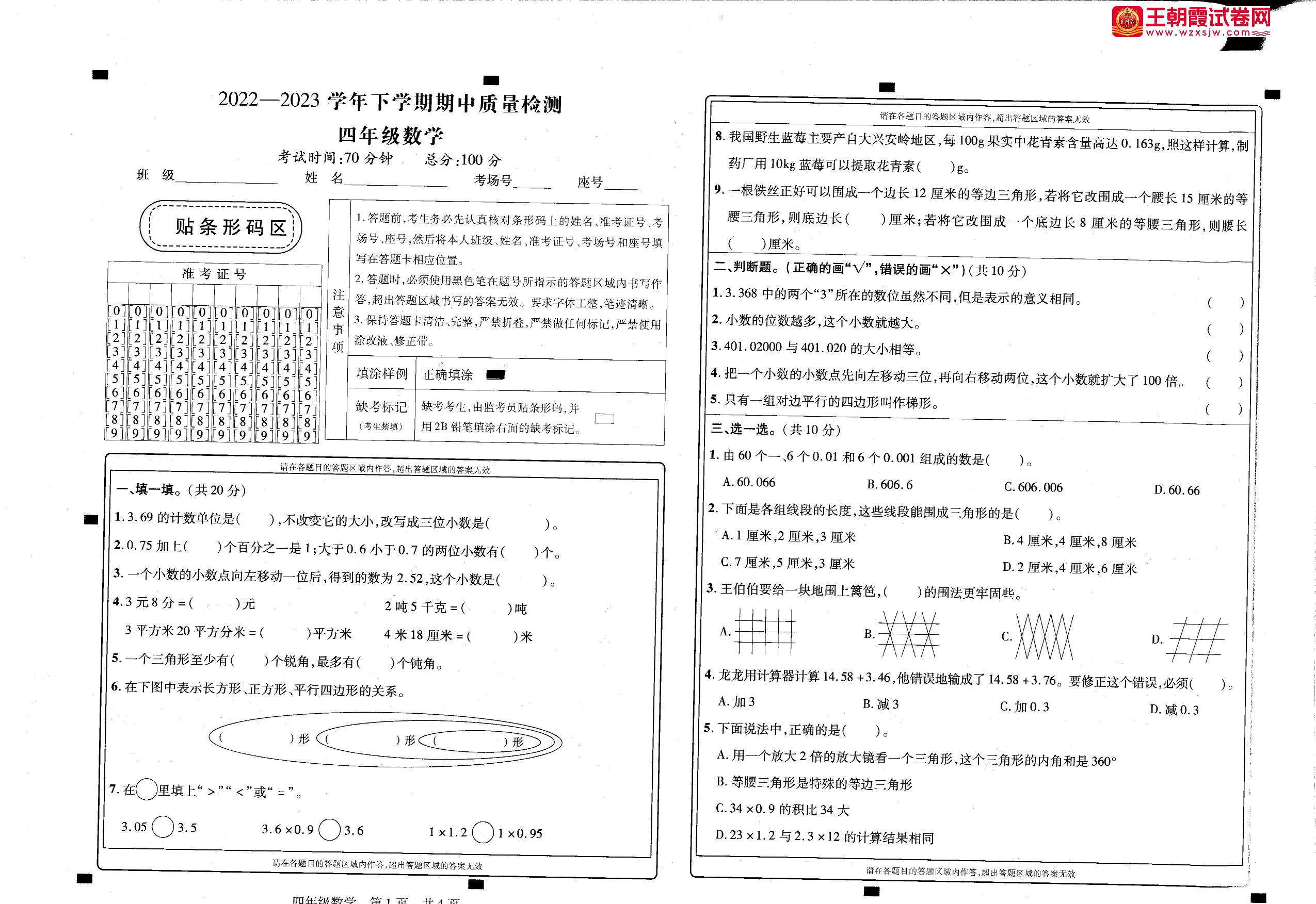 河南省驻马店市上蔡县和店镇2022—2023学年下学期期中质量检测试卷四年级数学(北师版)