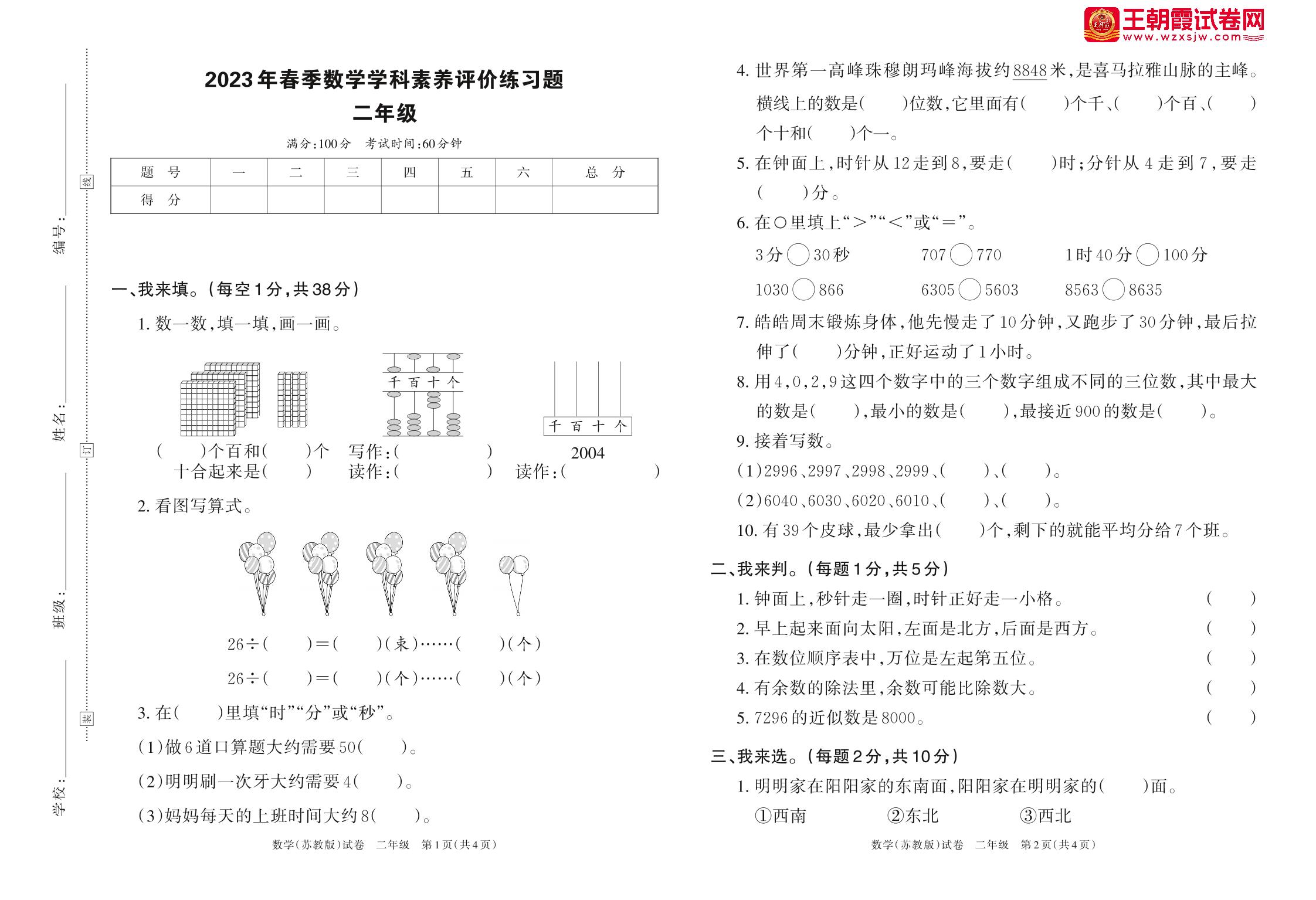 二年级数学苏教版下册期中卷