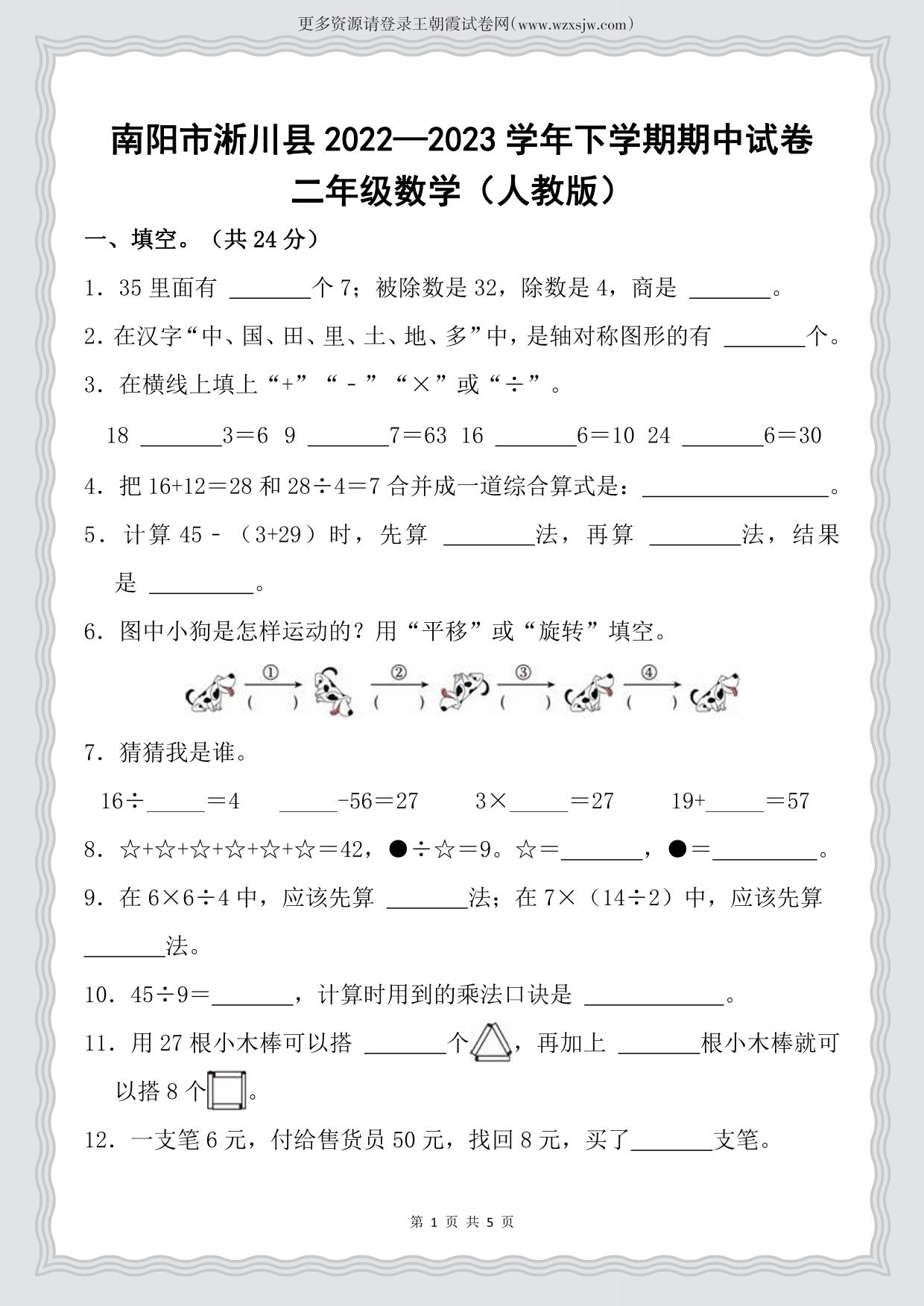 河南省南阳市淅川县2022—2023学年下学期期中二年级数学试卷(人教版)