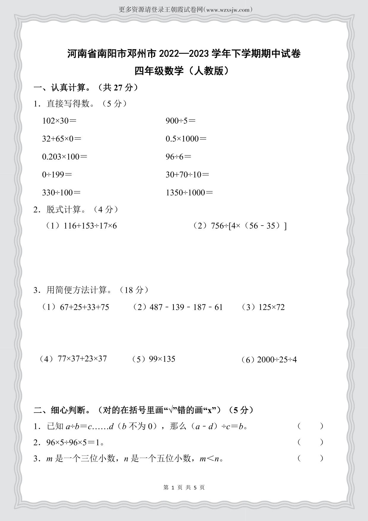 河南省南阳市邓州市2022—2023学年下学期期中试卷四年级数学(人教版)