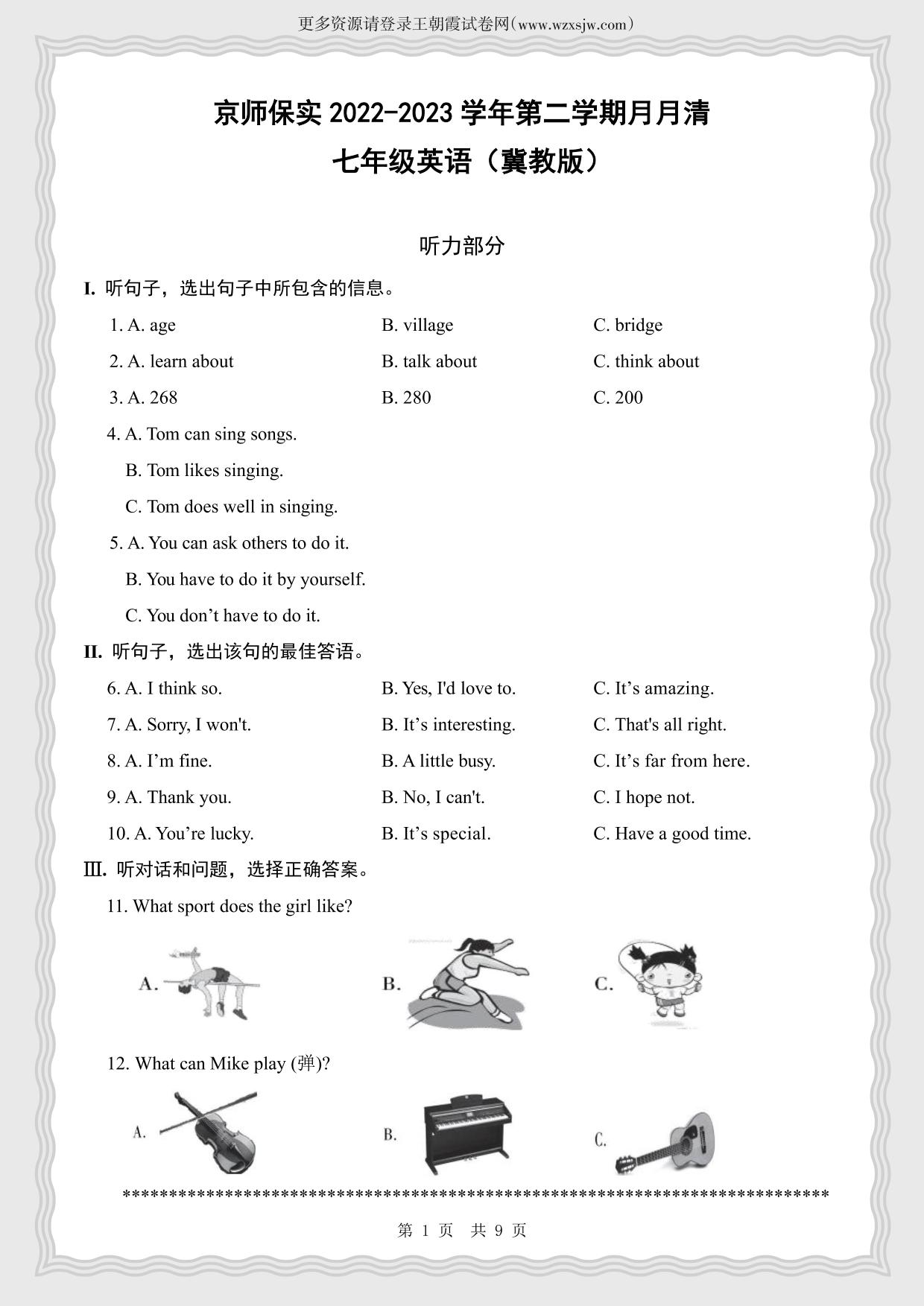 河北省北京师范大学保定实验学校2022-2023学年第二学期第一次月考七年级英语(冀教版)