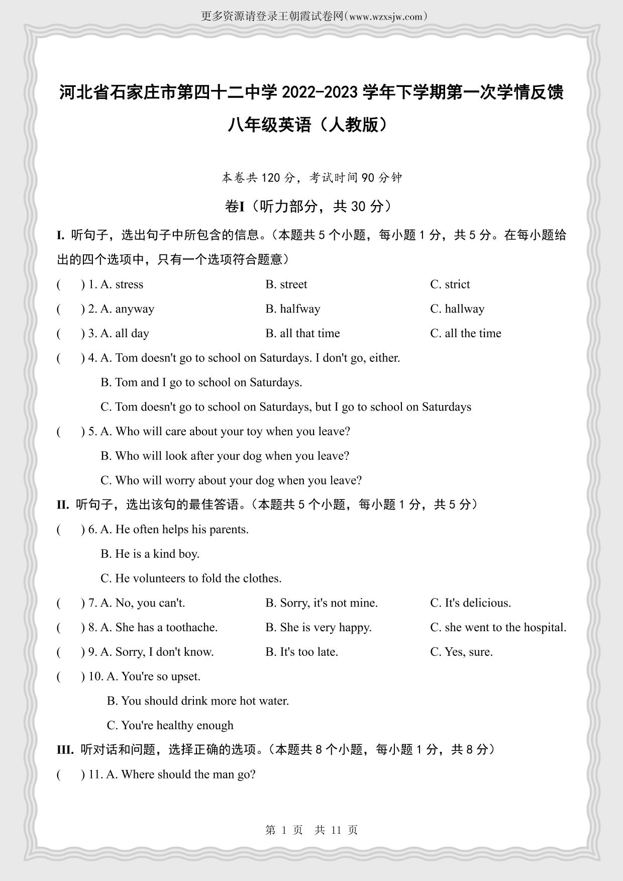 河北省石家庄市第四十二中学2022-2023学年下学期第一次学情反馈3月月考八年级英语(人教版)【无听力音频】