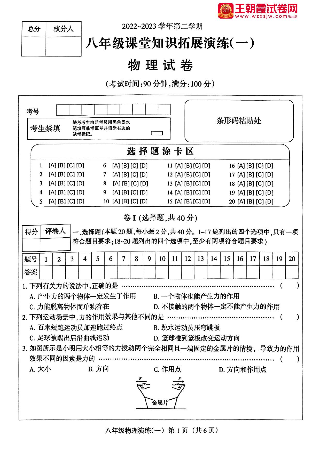 河北省沧州市献县万村中学2022-2023学年第二学期课堂知识拓展演练(一)3月月考八年级物理(人教版)