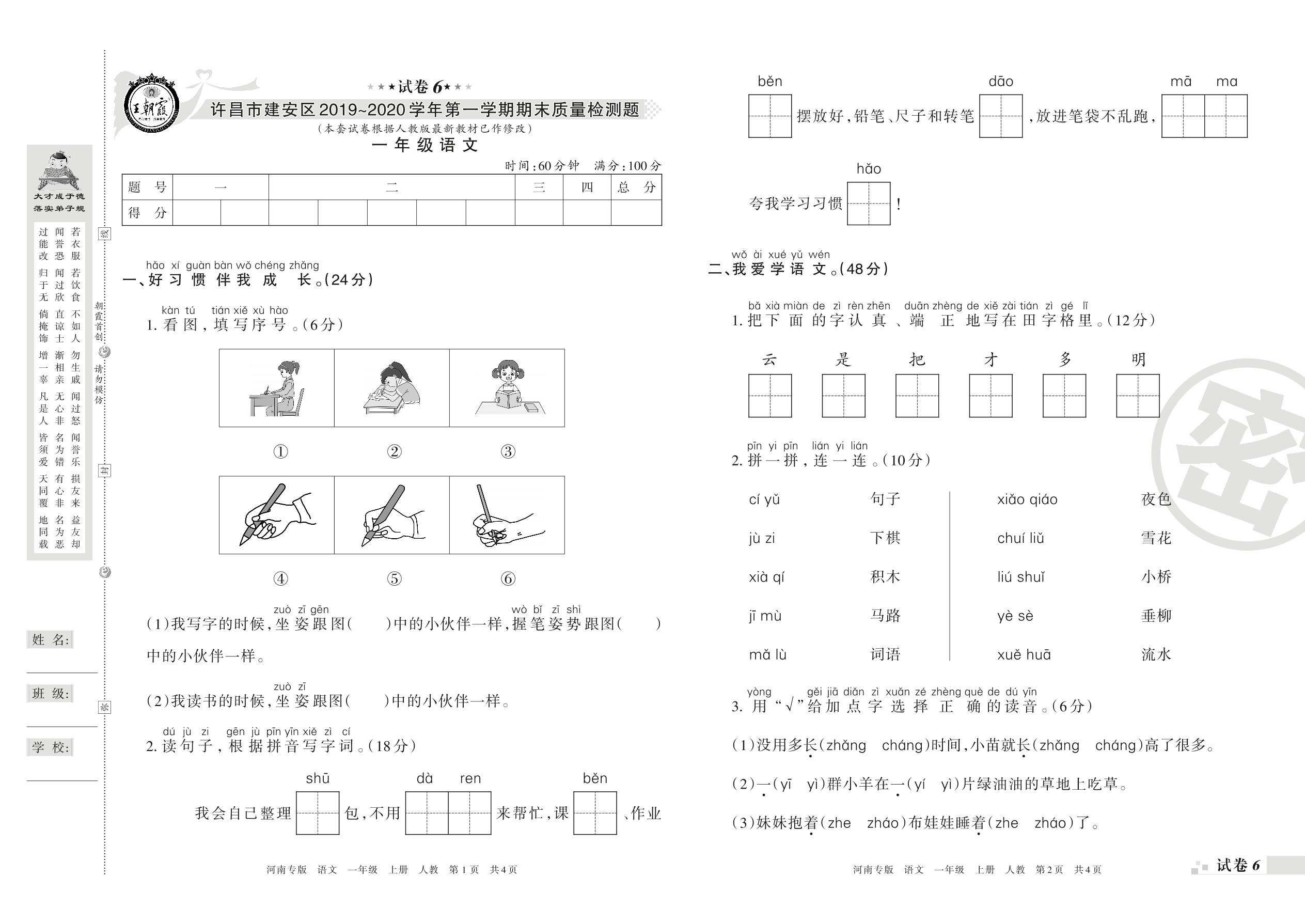2019-2020学年第一学期许昌市建安区一年级语文试卷(人教版)【6】