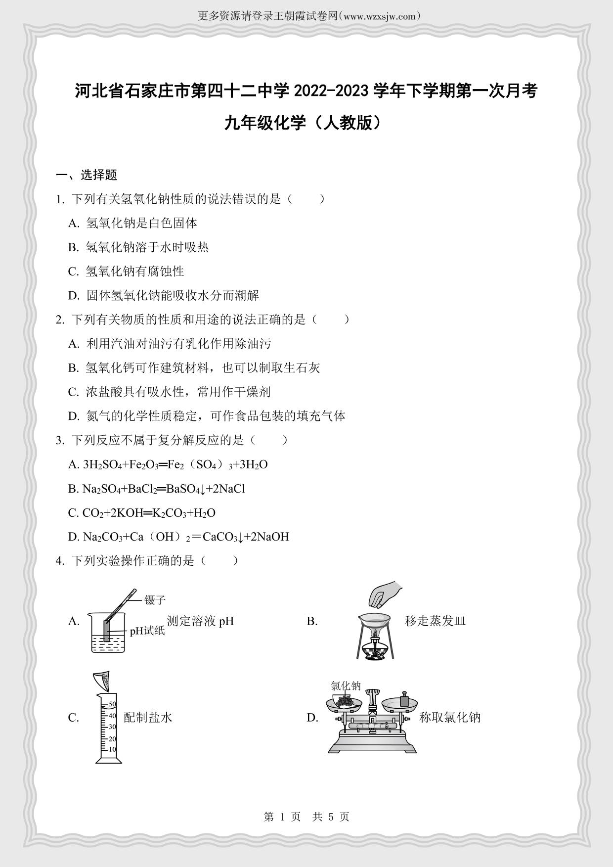 河北省石家庄市第四十二中学2022-2023学年下学期第一次月考九年级化学(人教版)