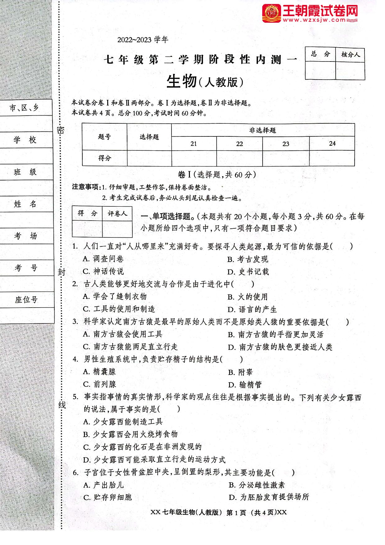 七年级生物人教版下册月考卷