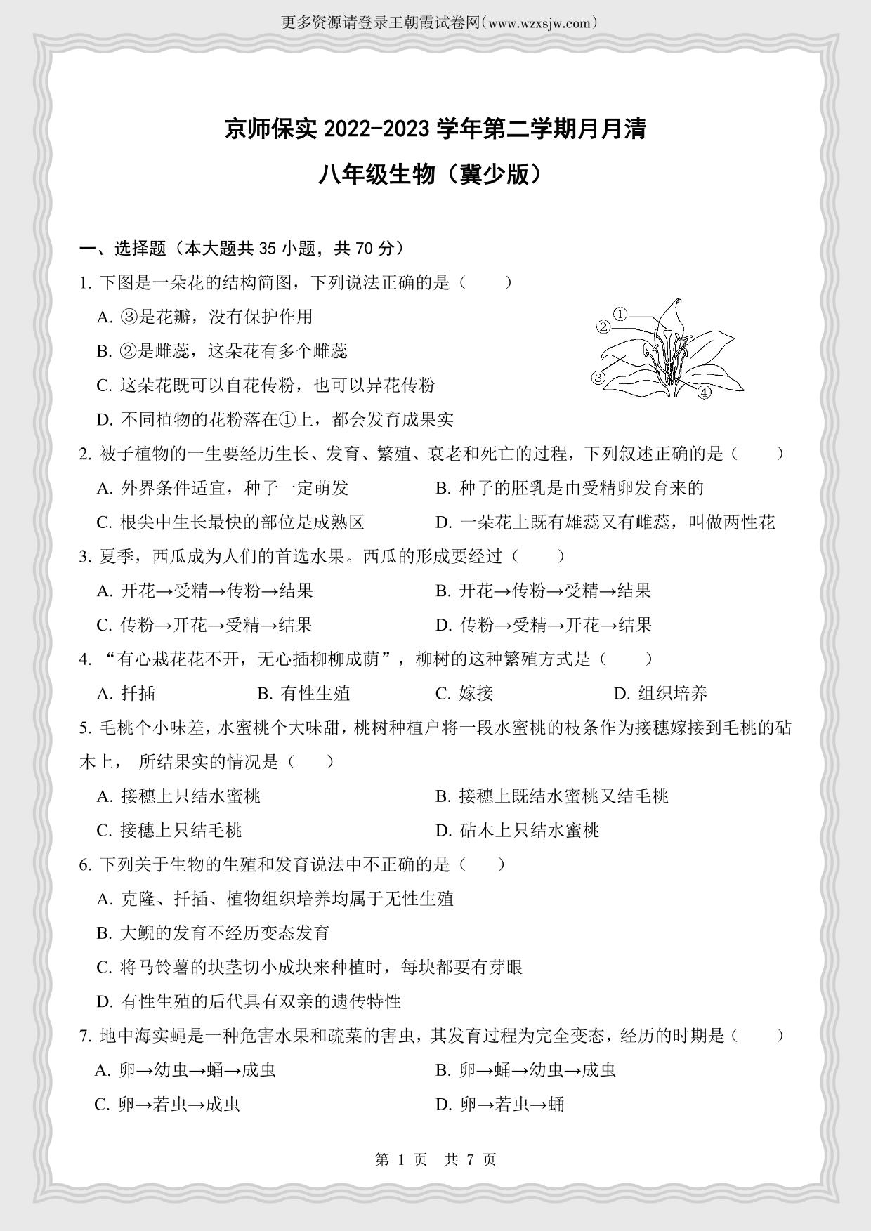 河北省北京师范大学保定实验学校2022-2023学年第二学期第一次月考八年级生物(冀少版)