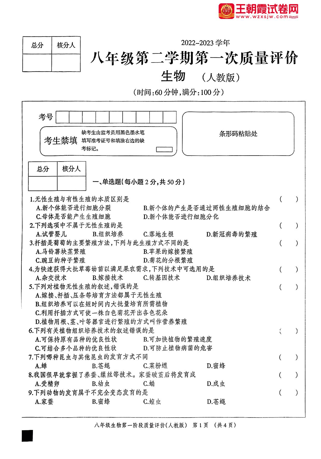 八年级生物人教版下册月考卷