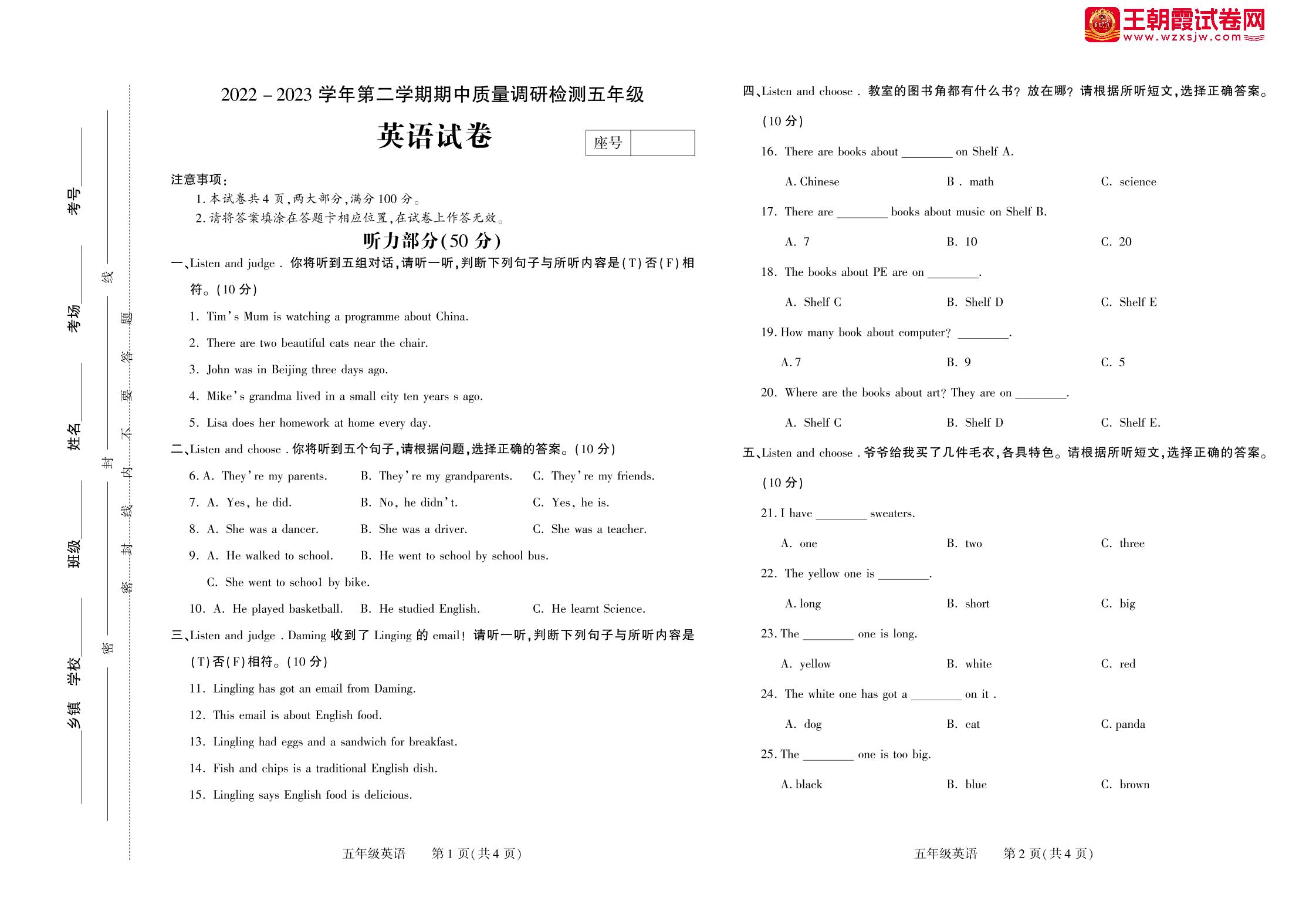 河南省洛阳市伊川县2022—2023学年下学期期中质量调研检测试卷五年级英语(外研版)【无听力音频】