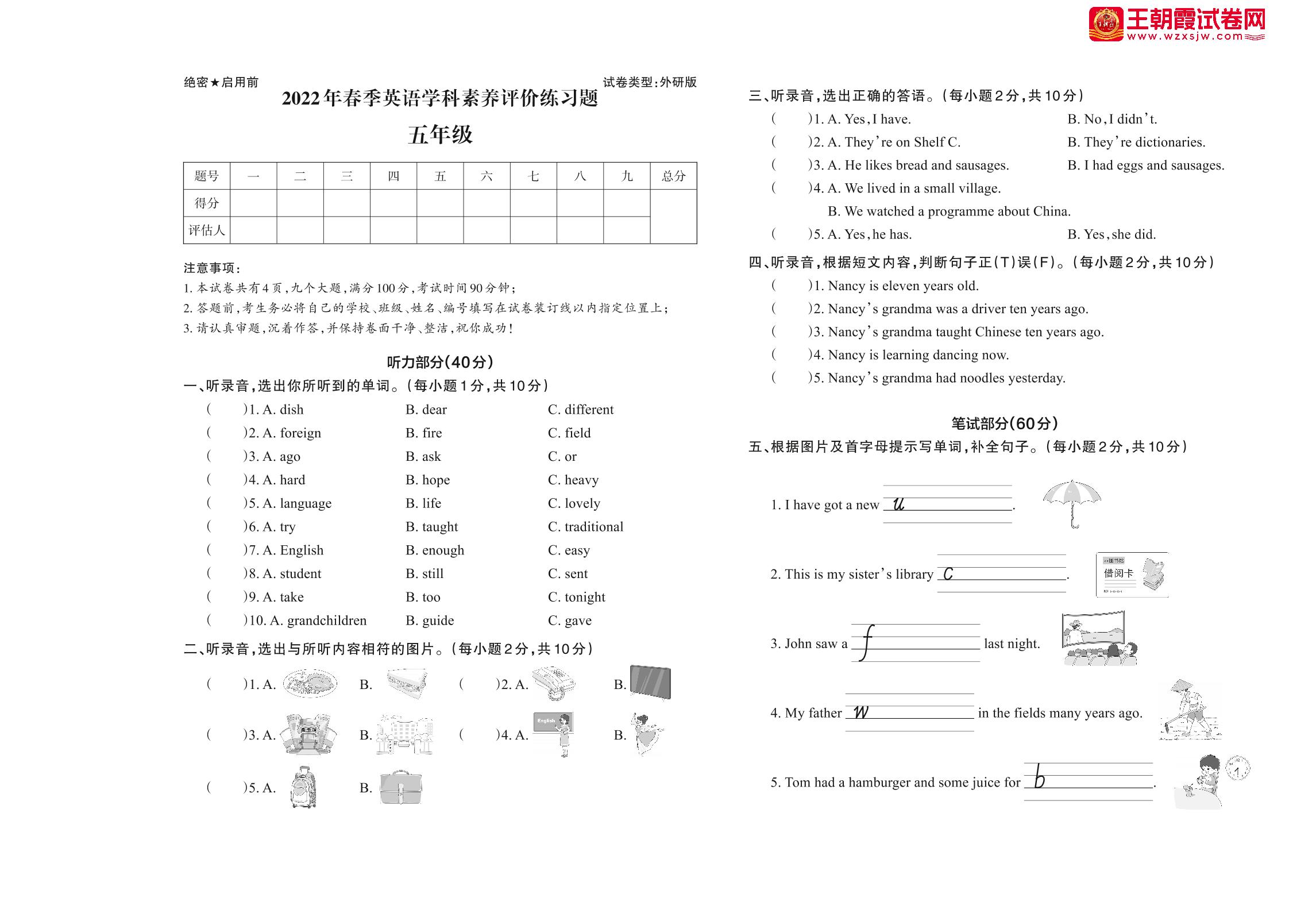 河南省洛阳市栾川县2022—2023学年下学期学科素养评价期中练习题五年级英语(外研版)
