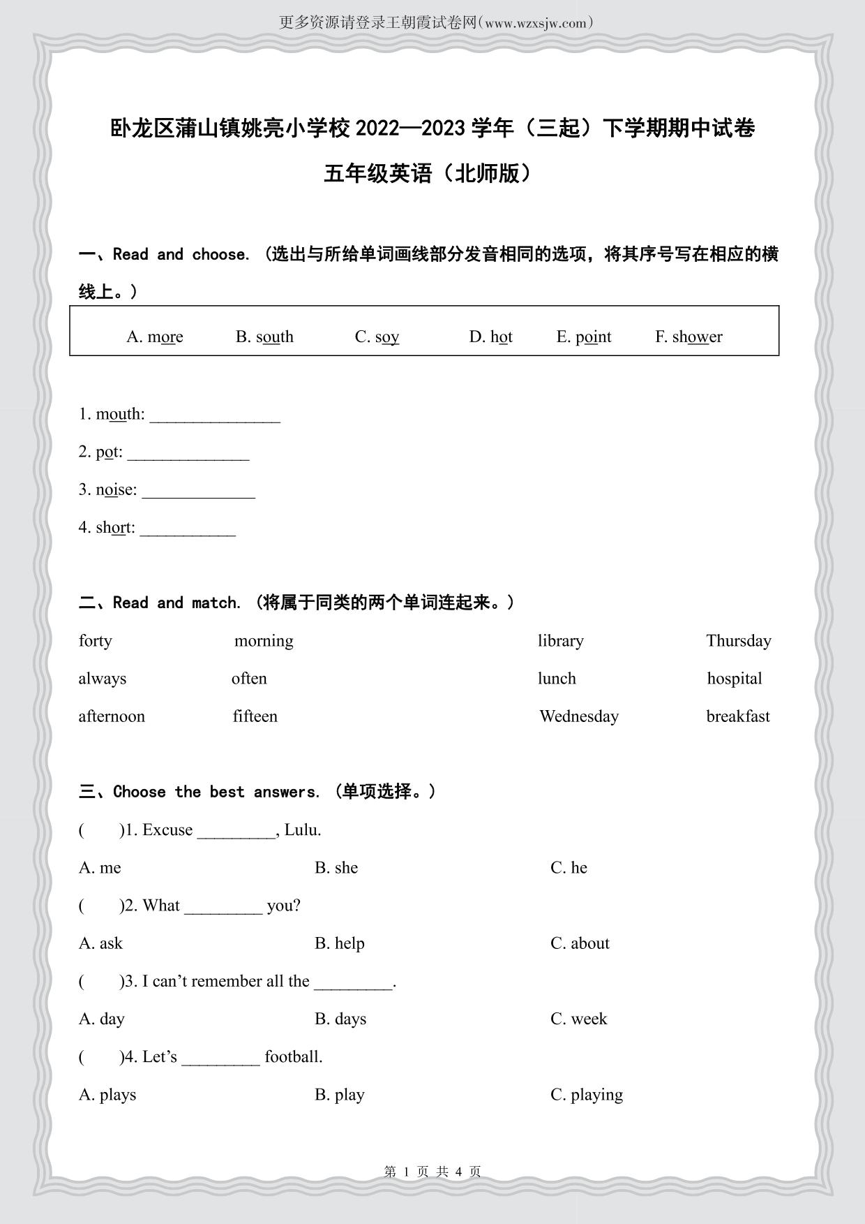 河南省南阳市卧龙区蒲山镇姚亮小学校2022—2023学年(三起)下学期期中试卷五年级英语(北师版)【无听力音频】