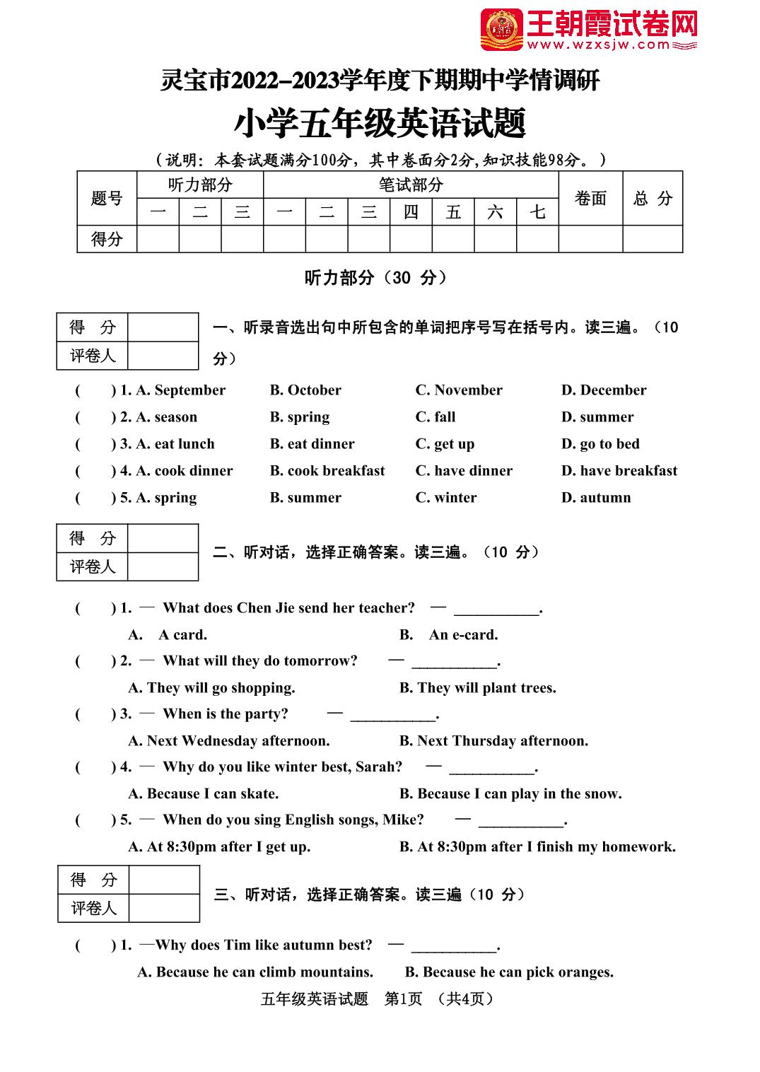 河南省平顶山市灵宝市2022—2023学年下学期期中学情调研试题五年级英语(人教PEP版)