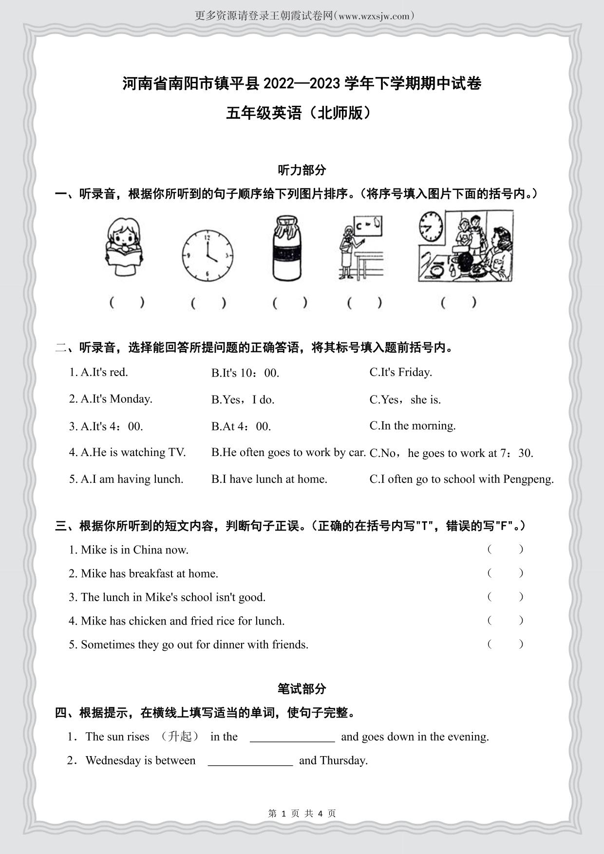 河南省南阳市镇平县2022—2023学年下学期期中试卷五年级英语(北师版)【无听力音频】