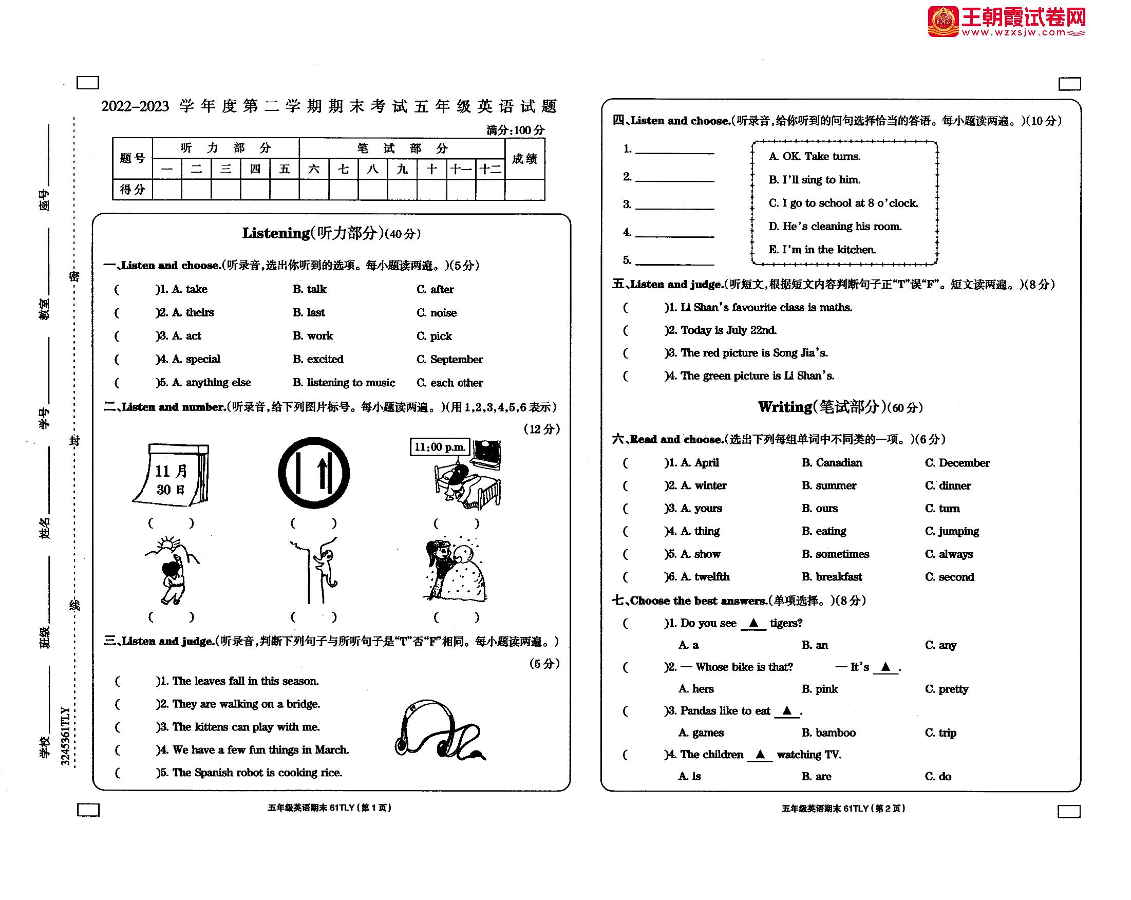 河南省周口市鹿邑县2022—2023学年下学期期末考试试题五年级英语(人教PEP版)【无听力音频】