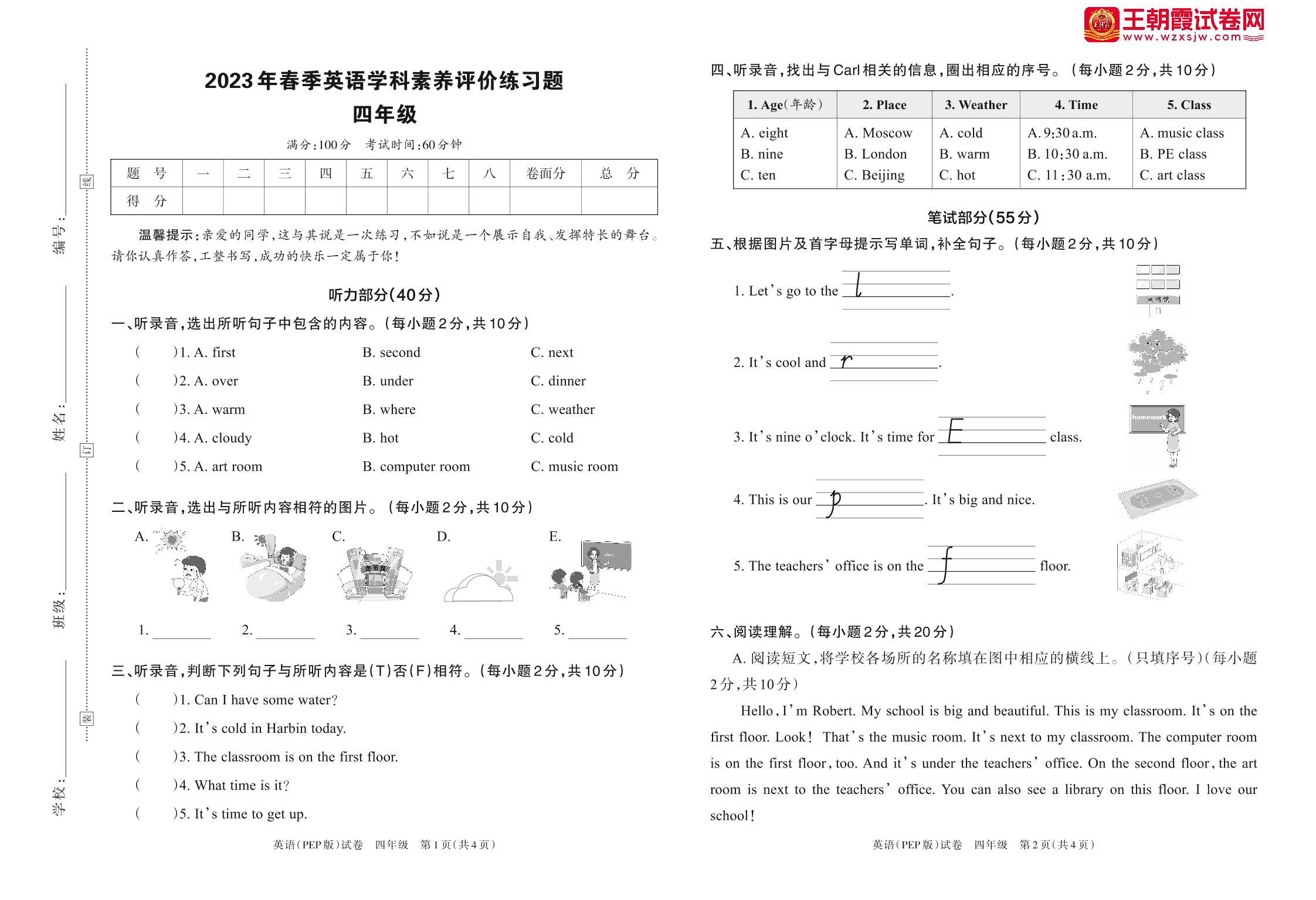 河南省郑州市中牟县2022—2023学年下学期期中学科素养评价练习题四年级英语(人教PEP版)