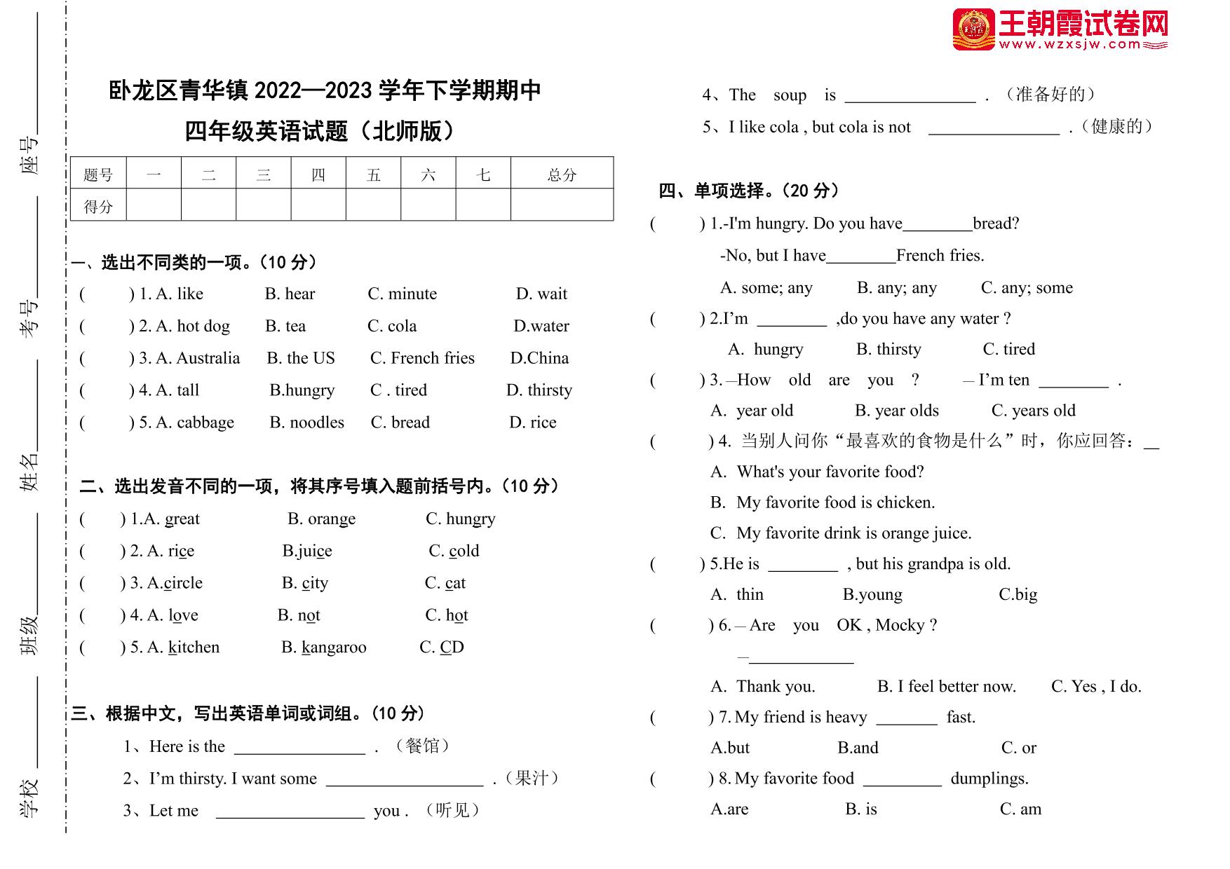 河南省南阳市卧龙区青华镇2022—2023学年下学期期中四年级英语试题(北师版)【无听力音频】