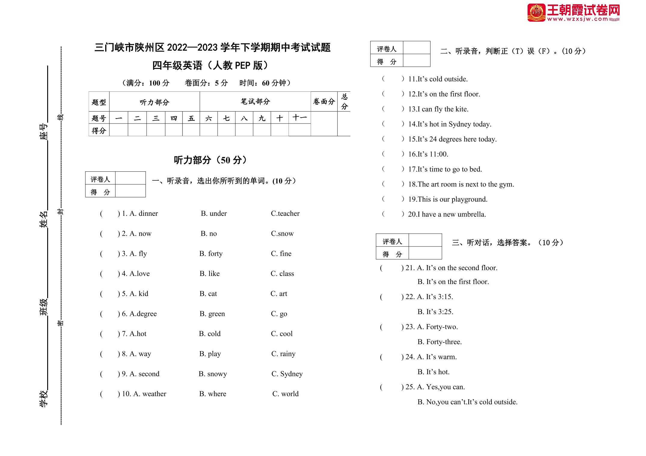 河南省三门峡市陕州区2022—2023学年下学期期中考试试题四年级英语(人教PEP版)【无听力音频】