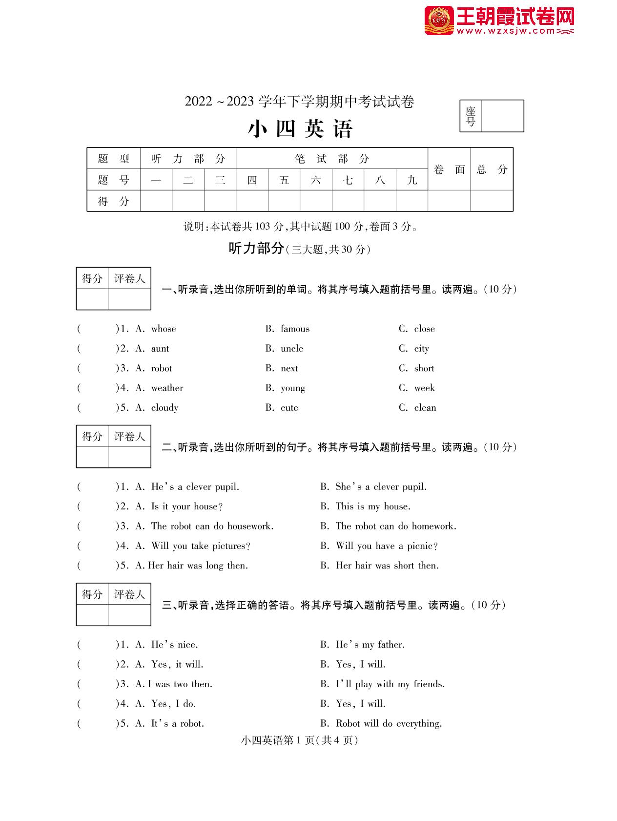 河南省平顶山市郏县2022—2023学年下学期期中试题四年级英语(外研版)【无听力音频】