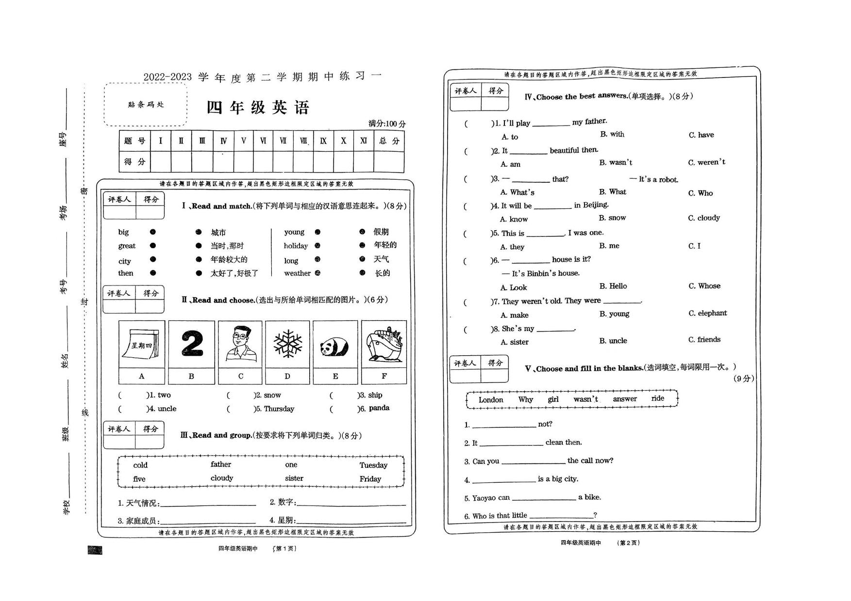 四年级英语外研版(三起始)下册期中卷