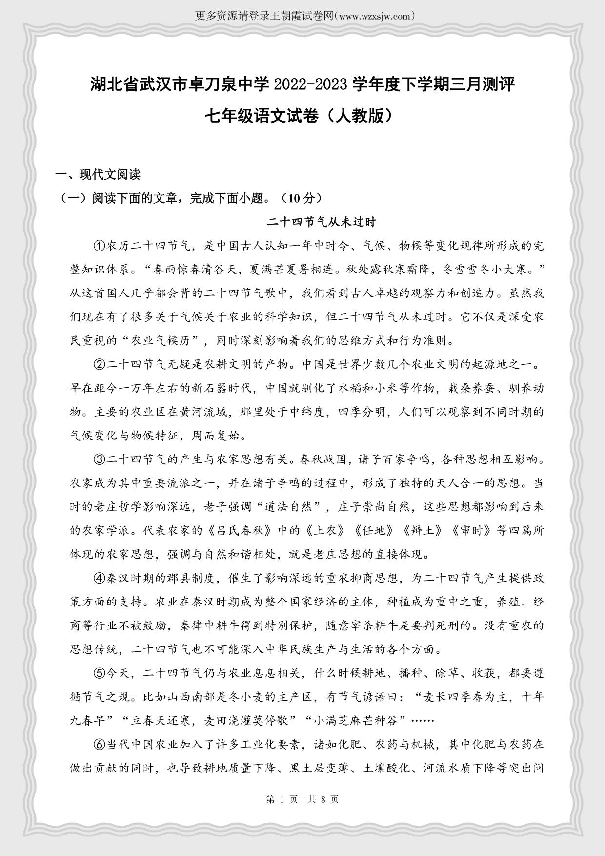 湖北省武汉市卓刀泉中学2022-2023学年度下学期三月测评七年级语文(人教版)
