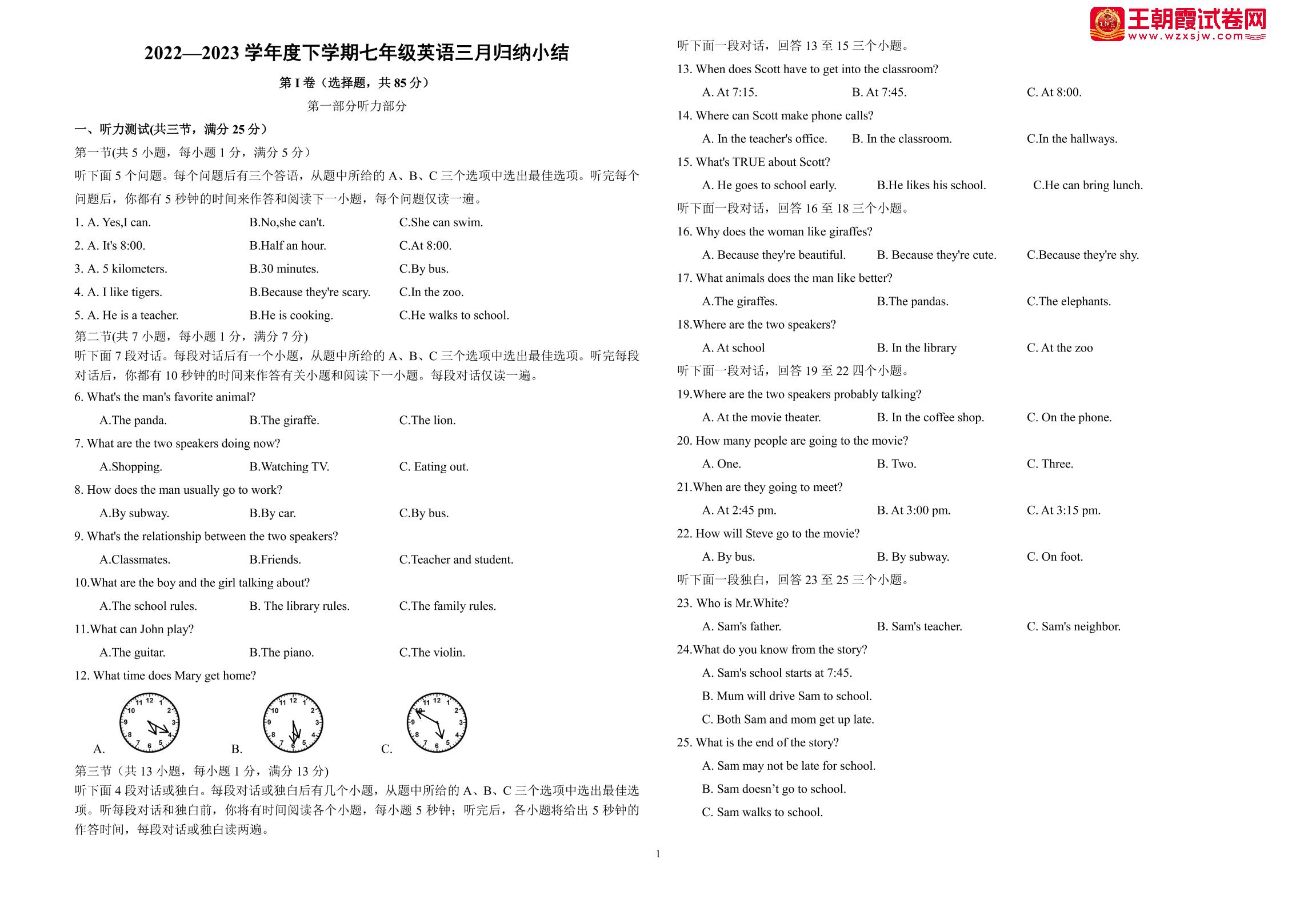 湖北省武汉市七一华源2022-2023学年下学期3月考七年级英语试卷(人教版)【无听力音频】