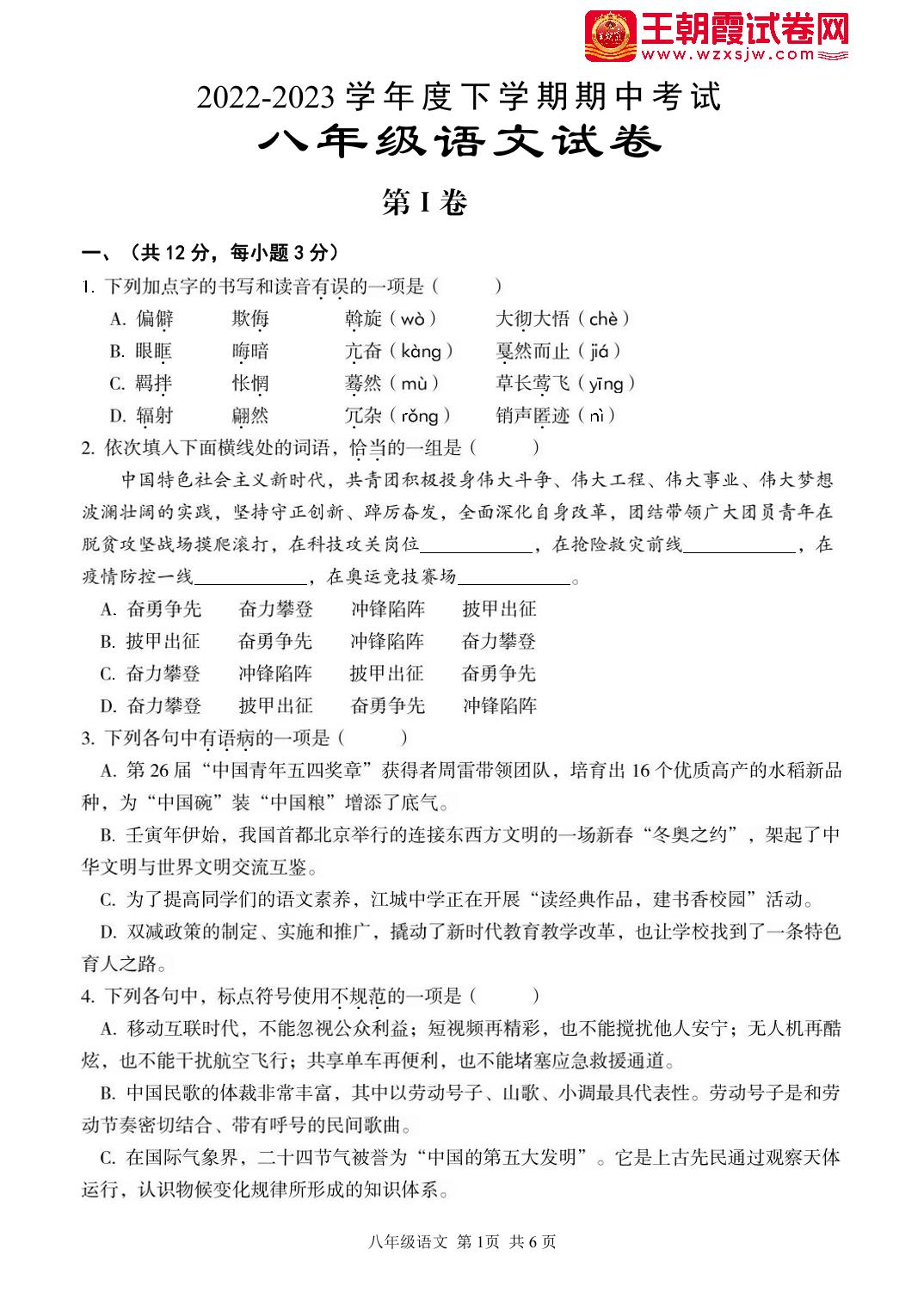 湖北省武汉市东西湖区2022-2023学年度下学期期中考试八年级语文试卷(人教版)