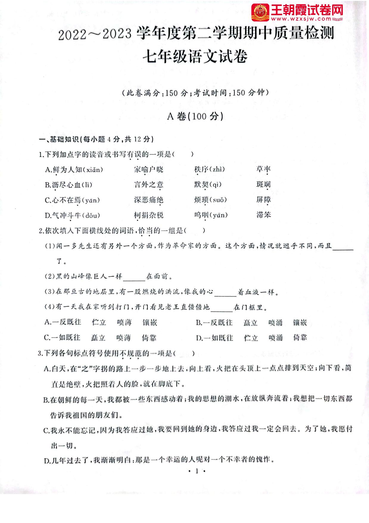 湖北省武汉市江汉区2022-2023学年下学期期中考试七年级语文试卷(人教版)
