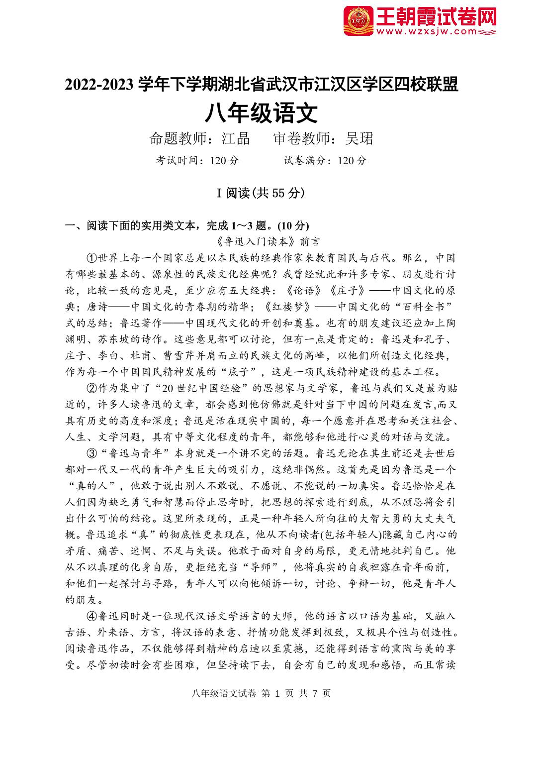 湖北省武汉市江汉区四校联盟2022~2023学年度下学期5月考八年级语文试题(人教版)