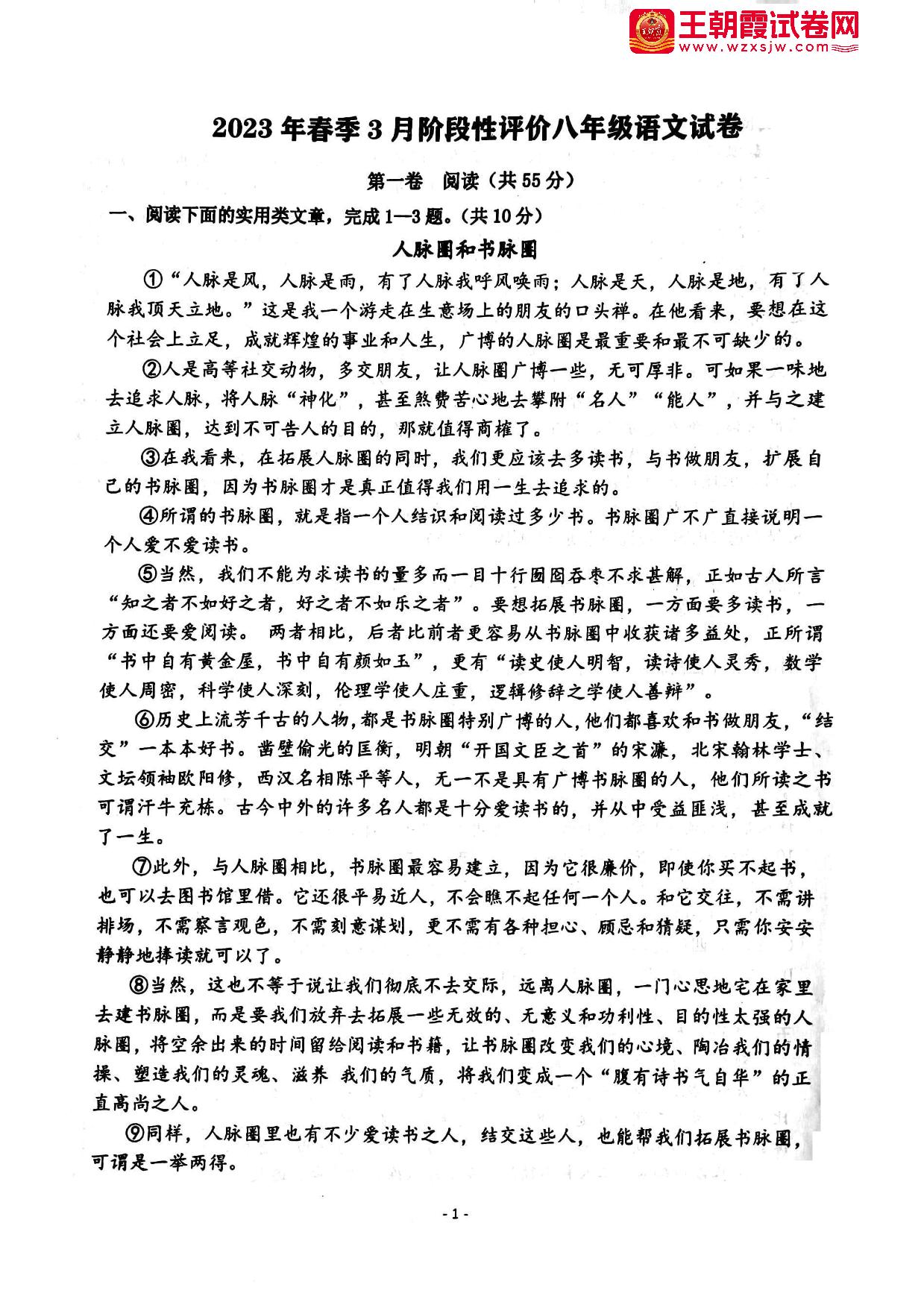 湖北省武汉市黄陂区前川三中2022-2023学年下学期3月考八年级语文试卷(人教版)