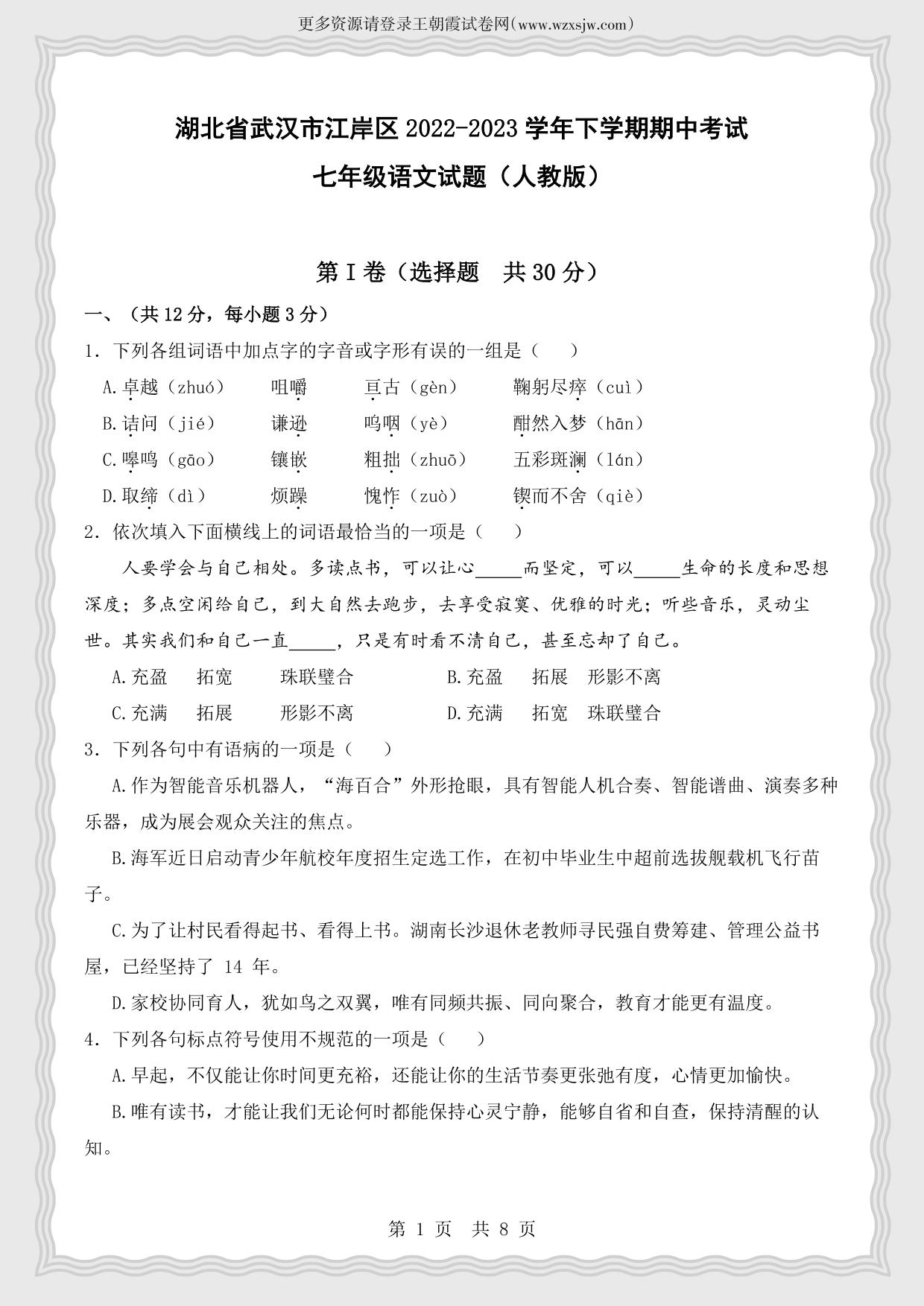 湖北省武汉市江岸区2022-2023学年下学期期中考试七年级语文试题(人教版)