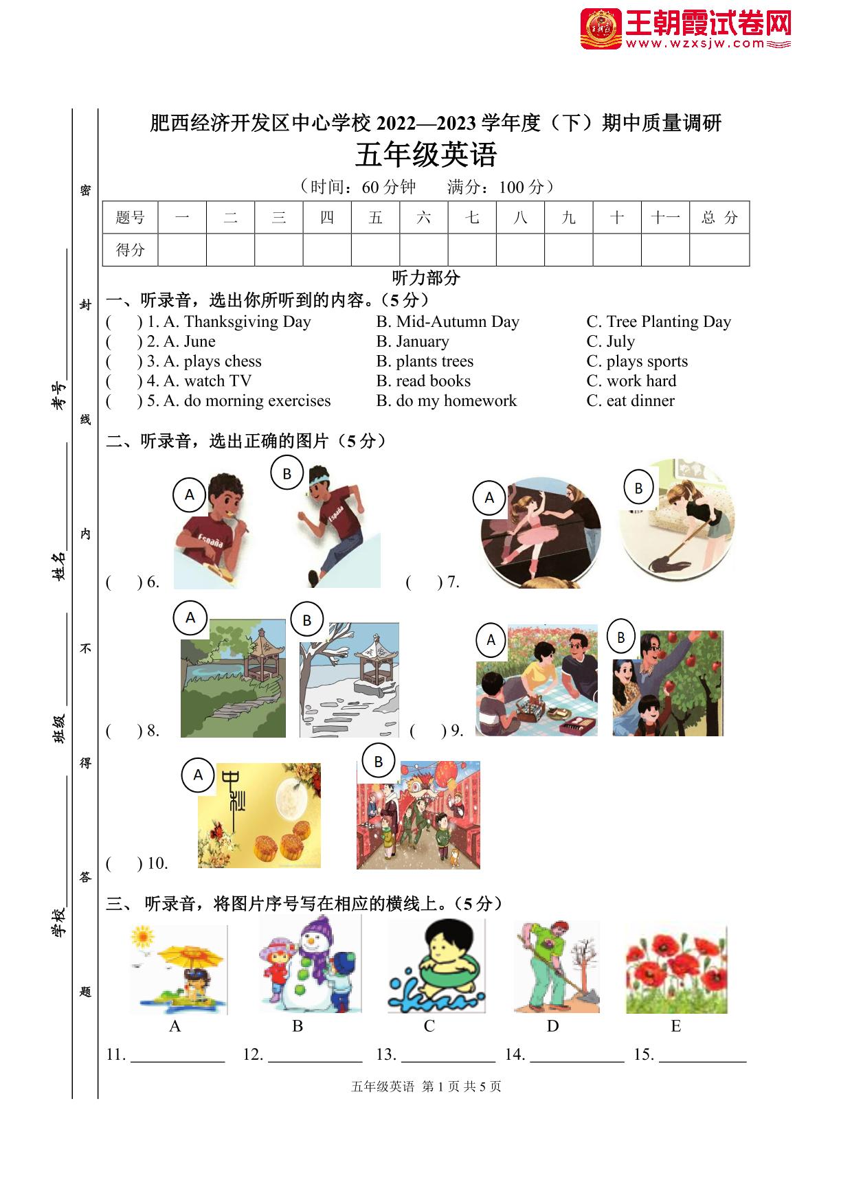 安徽省合肥市肥西县经济开发区中心学校2022-2023学年度下学期期中质量调研五年级英语(PEP版)